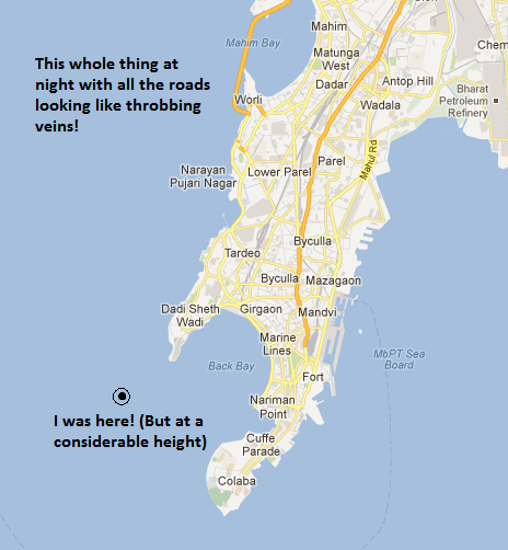 The next thing I know is the air-hostess poking me awake to keep my seat straight as we were about to land in Mumbai. Well, that was quick! 😛 The flight was still circling the city waiting for the signal to initiate landing. As we kept circling, I got to see one of the best views of Mumbai I had ever seen. We were going south upon which I saw the floodlight Wankhede stadium and the Taj hotel. I recognized these as I had done a fair bit of Google Earth-ing in the past. As we moved out of the city and over the sea, the flight swerved and showed the Mumbai that you see in maps with the only difference that it was night. It was beautiful! The whole city was lit with the Queen’s Necklace forming the outline at the bottom. I could spot the Worli sea-link jutting out into the sea. And the whole city was throbbing with the veins that were the roads full of streetlights and vehicles.