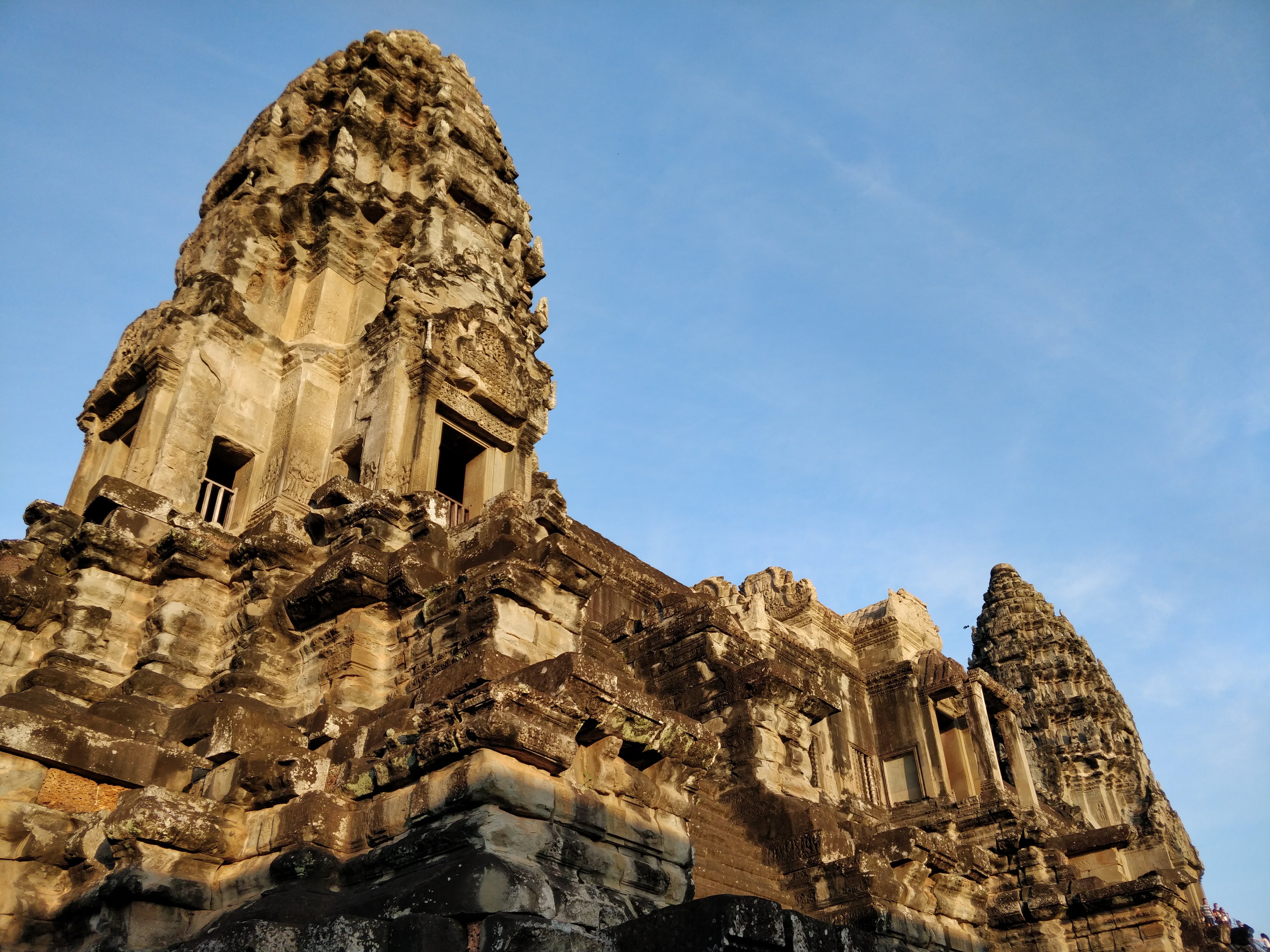 Our first stop was the main attraction – Angkor Wat. Our tuk-tuk rushed as fast as it could to one side of the moat (which outlines the temple) and we waited for the sunrise. It was very peaceful – even though we were accompanied by another 20-odd people who were also waiting for the sunrise, there was no sound as everyone was savouring the moment. A cool breeze was flowing – the temperature was at least a few degrees lower inside the park thanks to the dense forest cover. As the sky turned from dark purple to dark blue with shades of red and orange, we got our first glimpse of the silhouette of the temple. There were a lot of lotuses on the water. Oh yes, and the birds – with every minute, more birds of various kinds joined the morning chorus. It was a beautiful experience – worth waking up at 3:30 in the morning! We got some decent shots of the temple and once the sun was up, we proceeded to the temple.