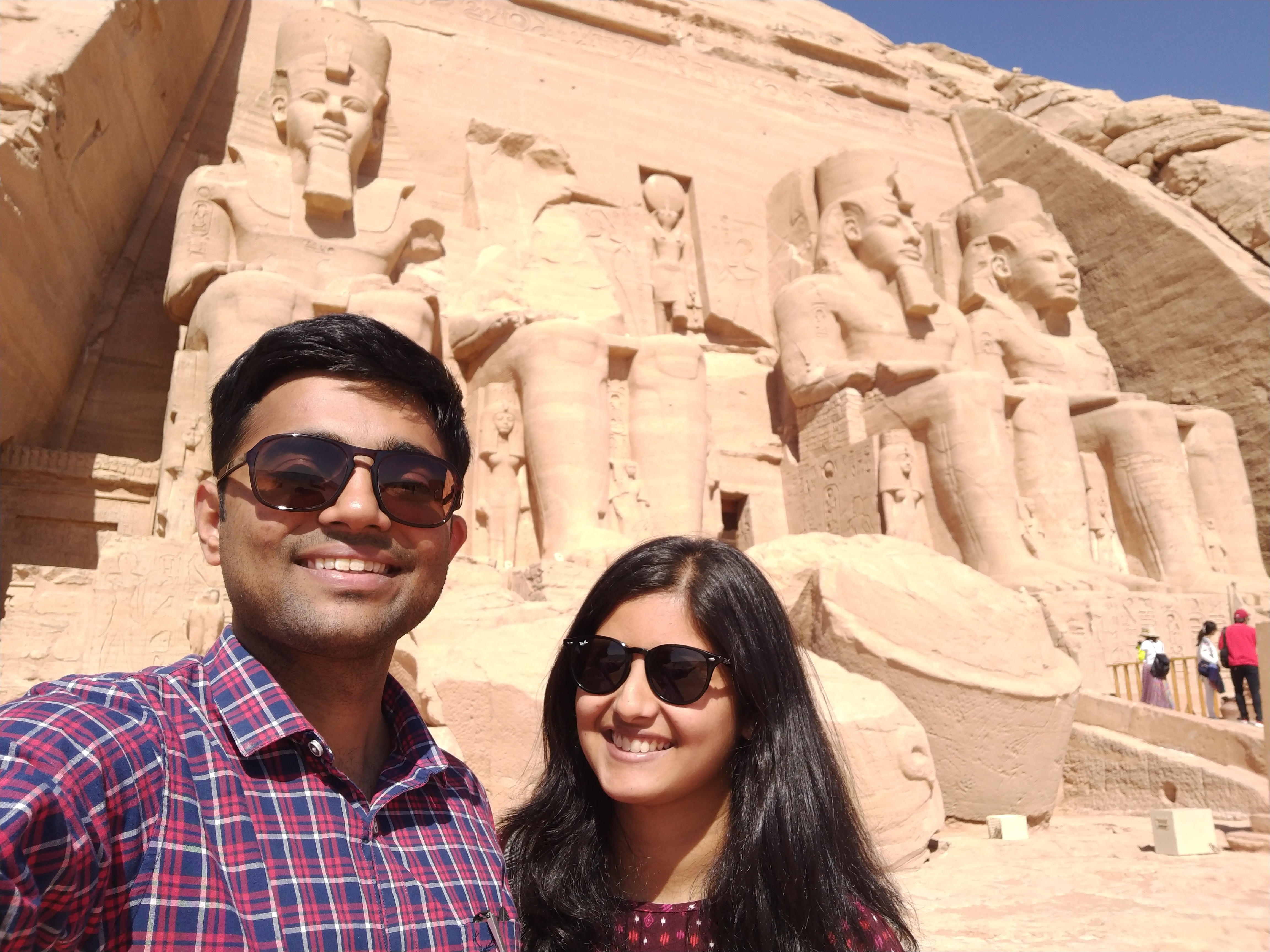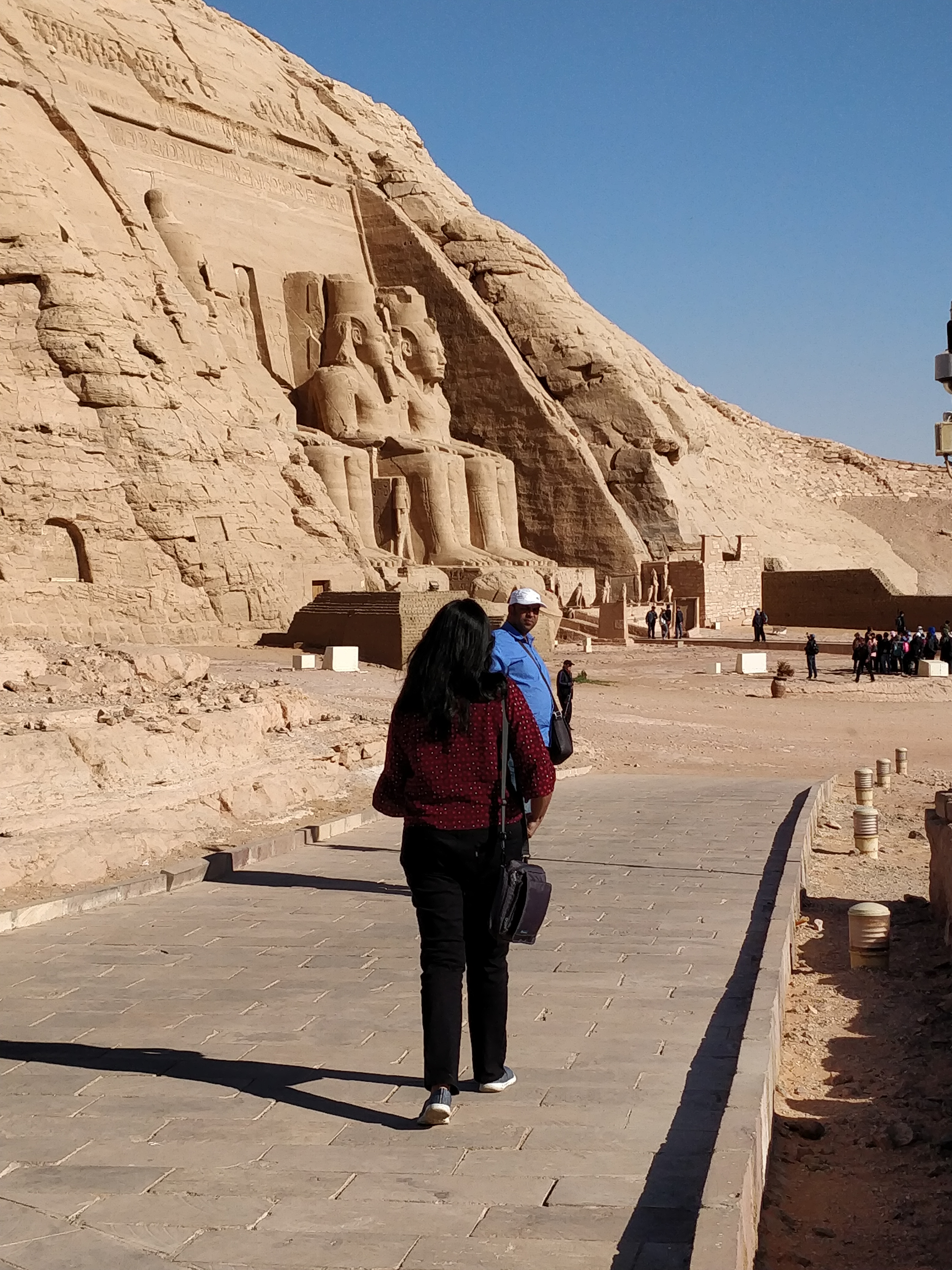 Our driver was determined to get us to our destination ASAP – he drove at over 120 kmph and we reached Abu Simbel in less than 3 hours. We were among the first few to reach there (Yaay!!). As we entered the complex, we could only see a hill and Lake Nasser on the other side. Ahmed showed us a place where the original temples stood (before the Aswan High Dam). By now, anticipation was growing and I couldn’t wait to see the iconic sight that we were here for. But where was it?