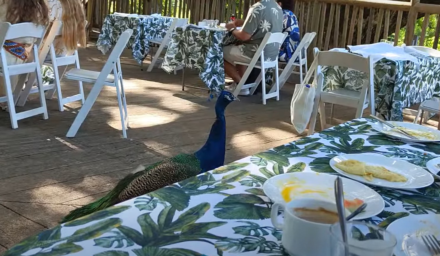 A bus took us to the giraffe feeding deck. It was a raised wooden platform with two giraffes on one side. The other corner of the deck had a table with food for the humans. Overall, there were around 6 families. Each group took turns to walk up to the giraffes to feed them. As we waited for our turn, other visitors arrived to greet us. A couple of zebras walked by and a peacock flew up to join us on the deck. It walked from table to table hoping that someone would feed it – with bad luck.