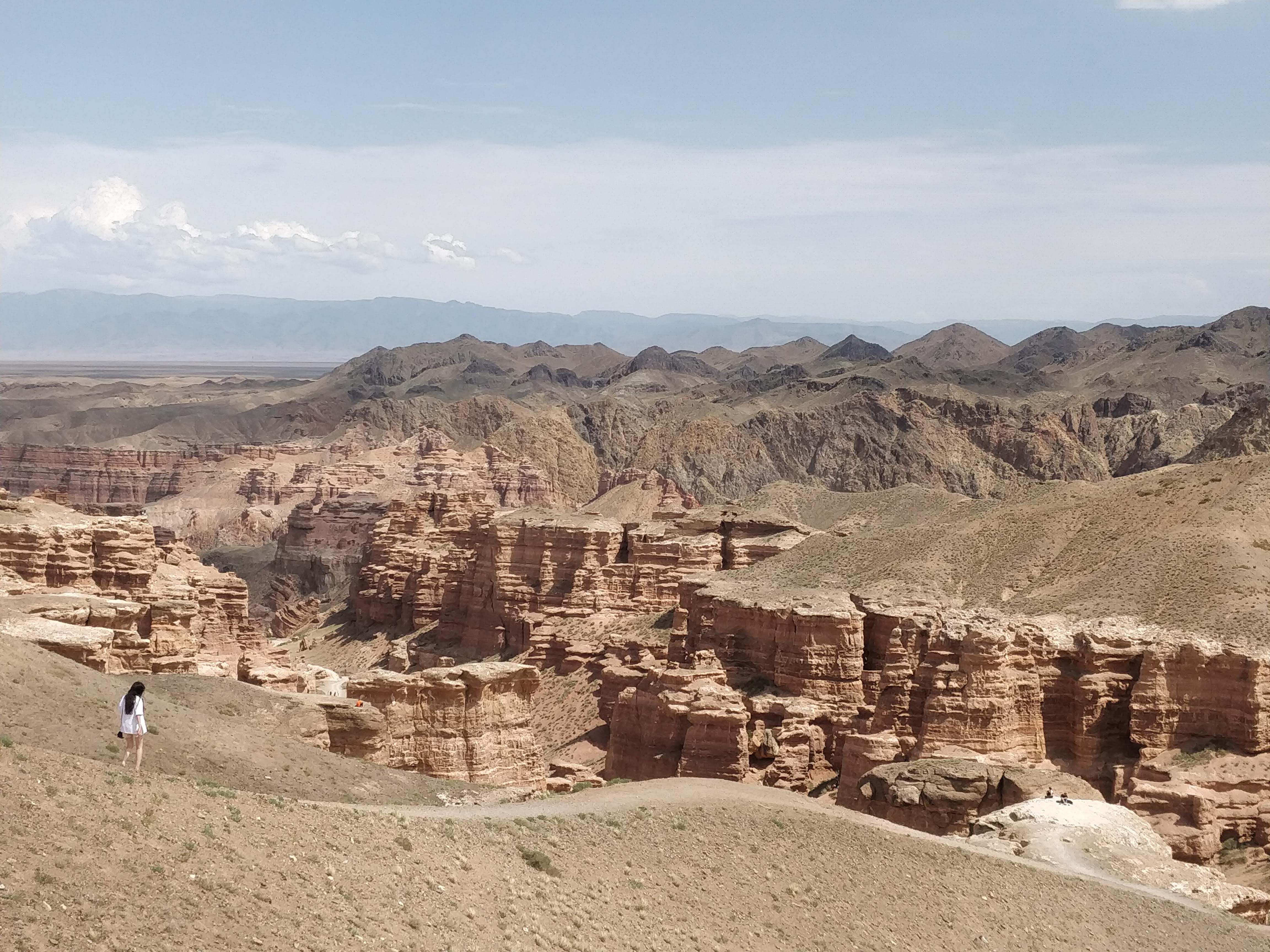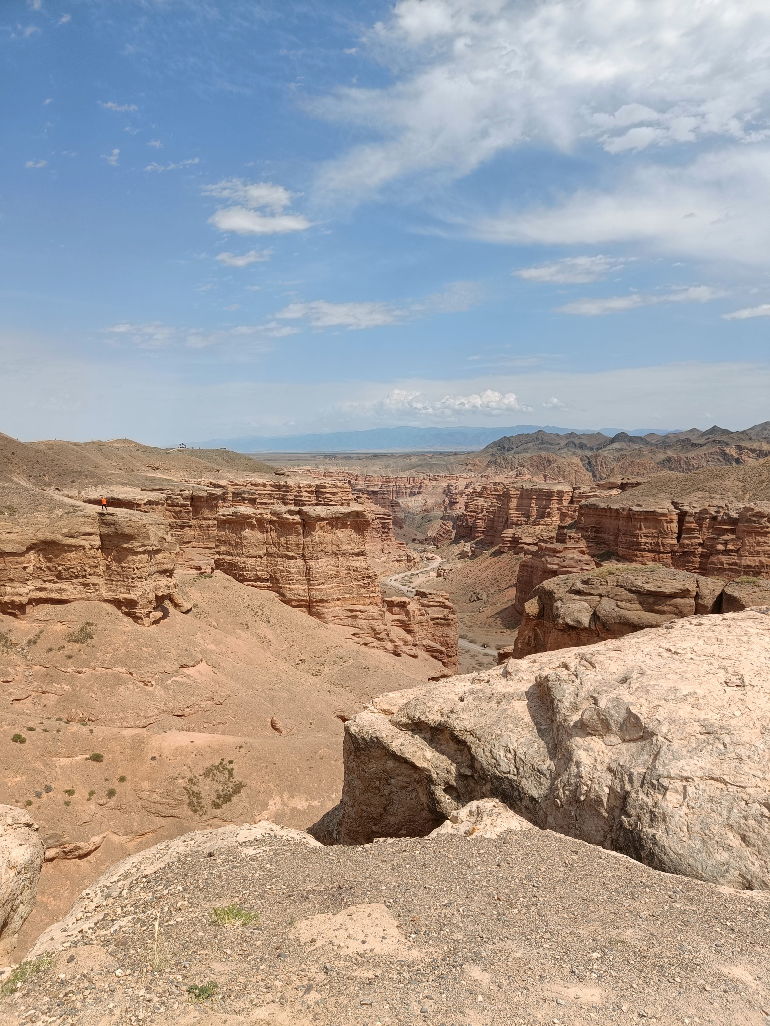 We entered the parking area to be greeted by many tour buses – these would be the day tours starting from Almaty. We walked along the path towards the “valley of castles” and to our surprise, there was no river! The bottom of the canyon was dry and there were vehicles running there and people walking! We had seen the river flowing through the Black Canyon but it seems to have diverted once it reached here. The canyon looked quite impressive but the heat was scorching.