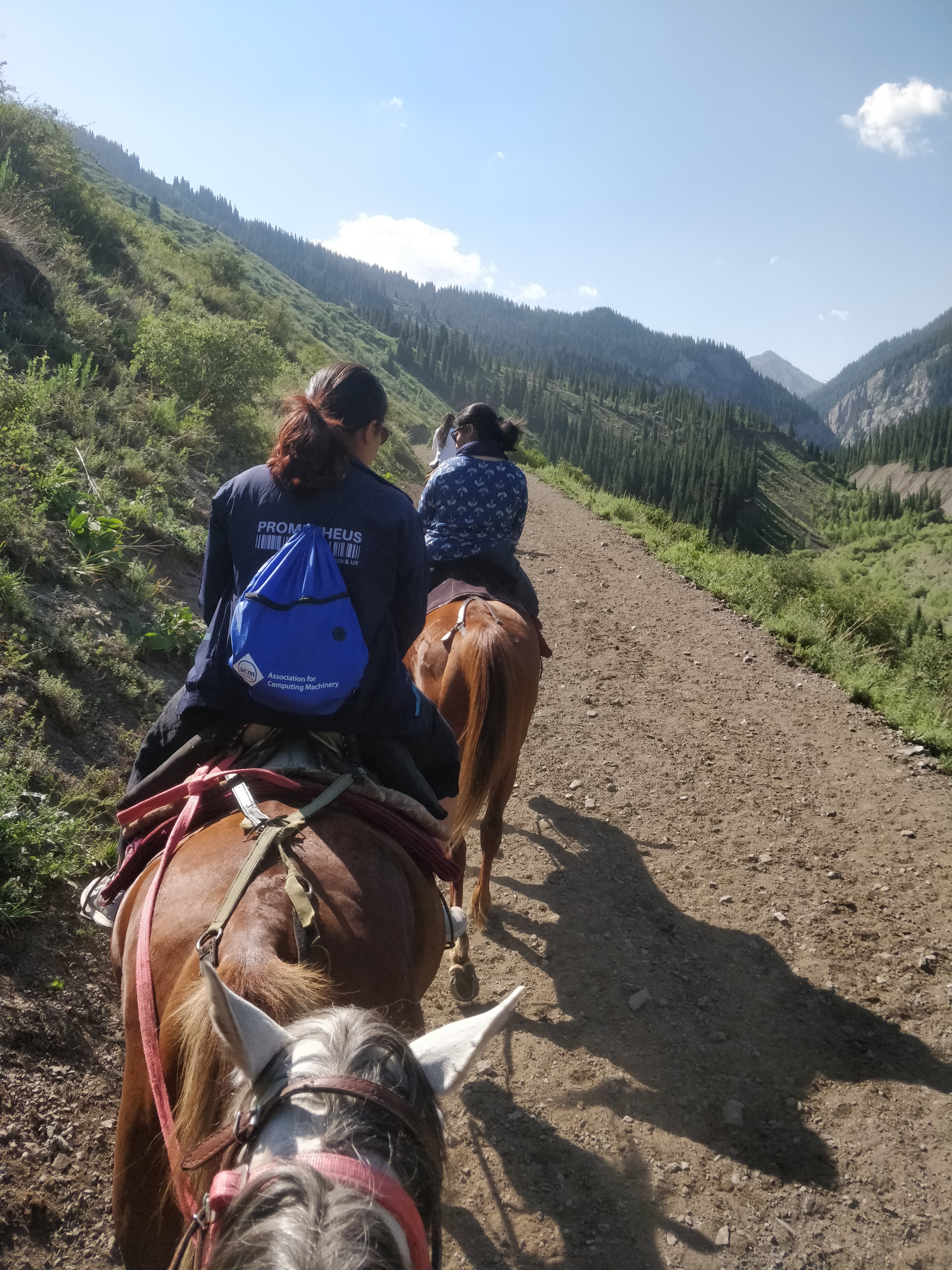 We reached the parking where our horses were waiting. Our guide, Aida asked whether we wanted our horses to be tied to each other – the answer was, of course, yes! We didn’t want our horse running off crazy on the side of the mountain! The initial path was a gentle upward slope which kept going for about 10 minutes. The last 6-7 mins was a steep descent and we got our first view of the lake. The horses dropped us at the end of the trail and we walked the last stretch for about 8-10 mins. There is also a walking path which is slightly longer – takes about 20-25 mins to get to the lake.