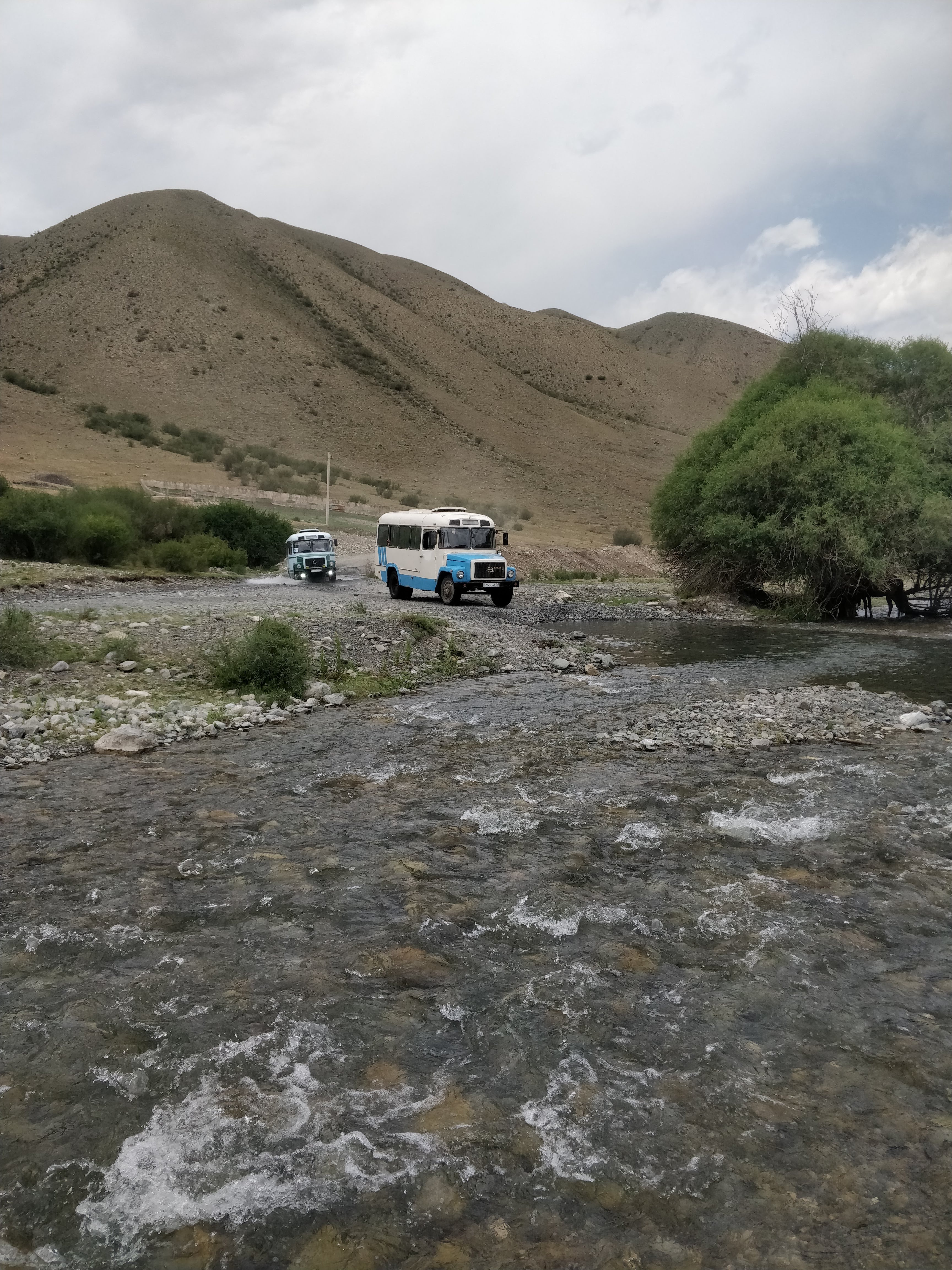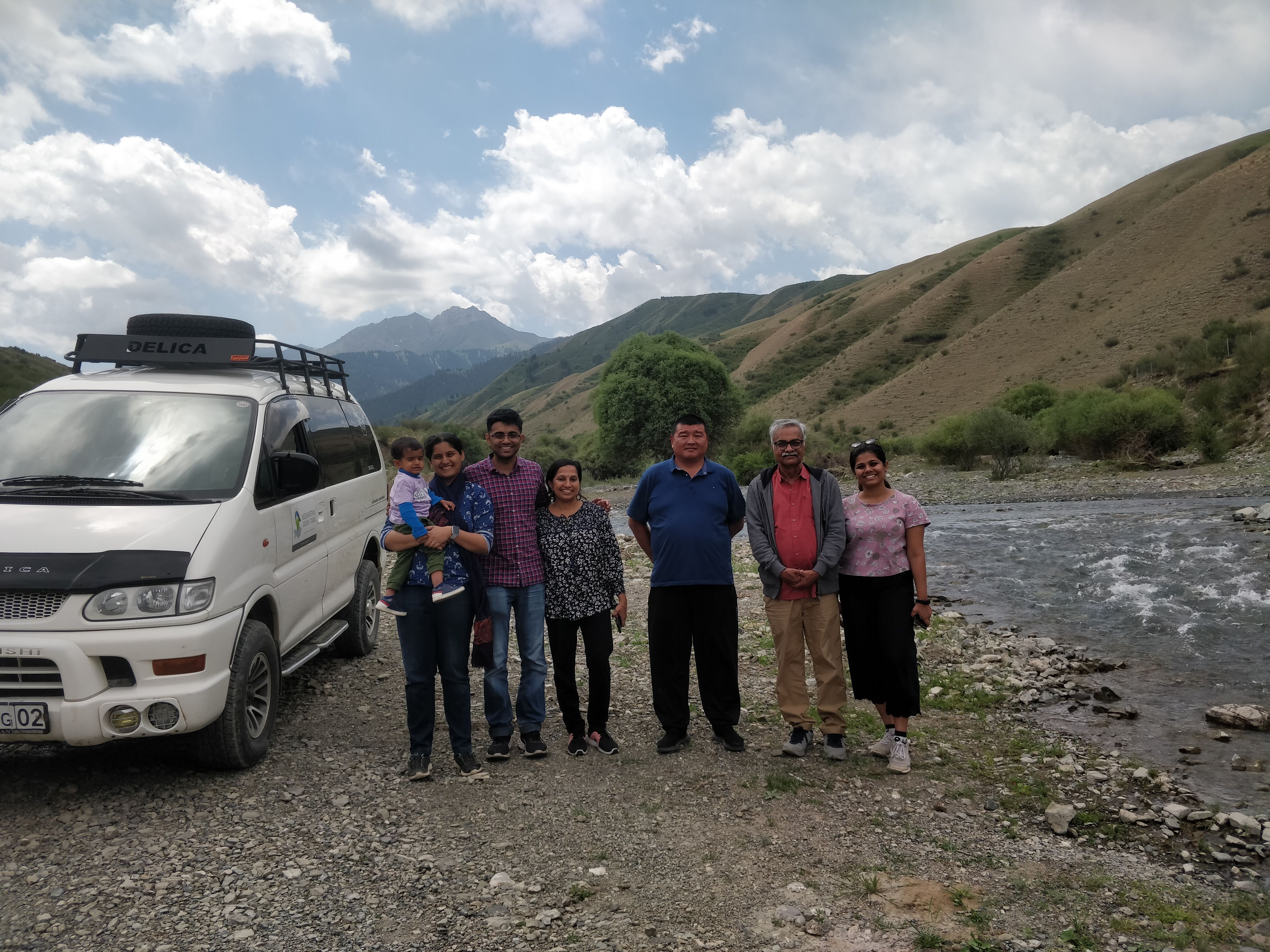 We made our way back on the horses and reached the parking. My parents and Parth were waiting for us. Parth wasn’t too thrilled to see us on horses and when Nam tried holding him, he quickly wanted to get down. We were glad we didn’t take him. On the way back to the guest house, we saw many many mashrutkas (local taxis) full of tourists making their way to the lake. We stopped near the point where the stream crossed the road and clicked some pics. The water was not too cold.