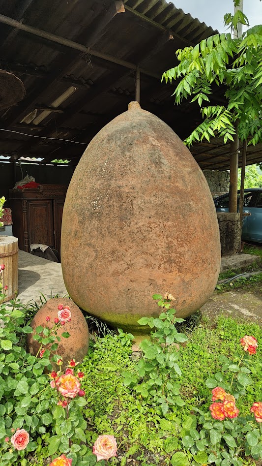 First, we saw the qvevris used for making wine. Qvevris are clay pots that are also home-made and shaped like a giant egg. It has a narrow mouth from where the grapes are poured in, crushed and extracted. The qvevri pots we had seen so far were actually tiny replicas of the real thing. The real qvevri was huge! The really big ones could hold more than a 5000 L of wine inside and can easily fit a person or two. These were always placed underground with only a narrow opening on top to perform all the wine-making activities.