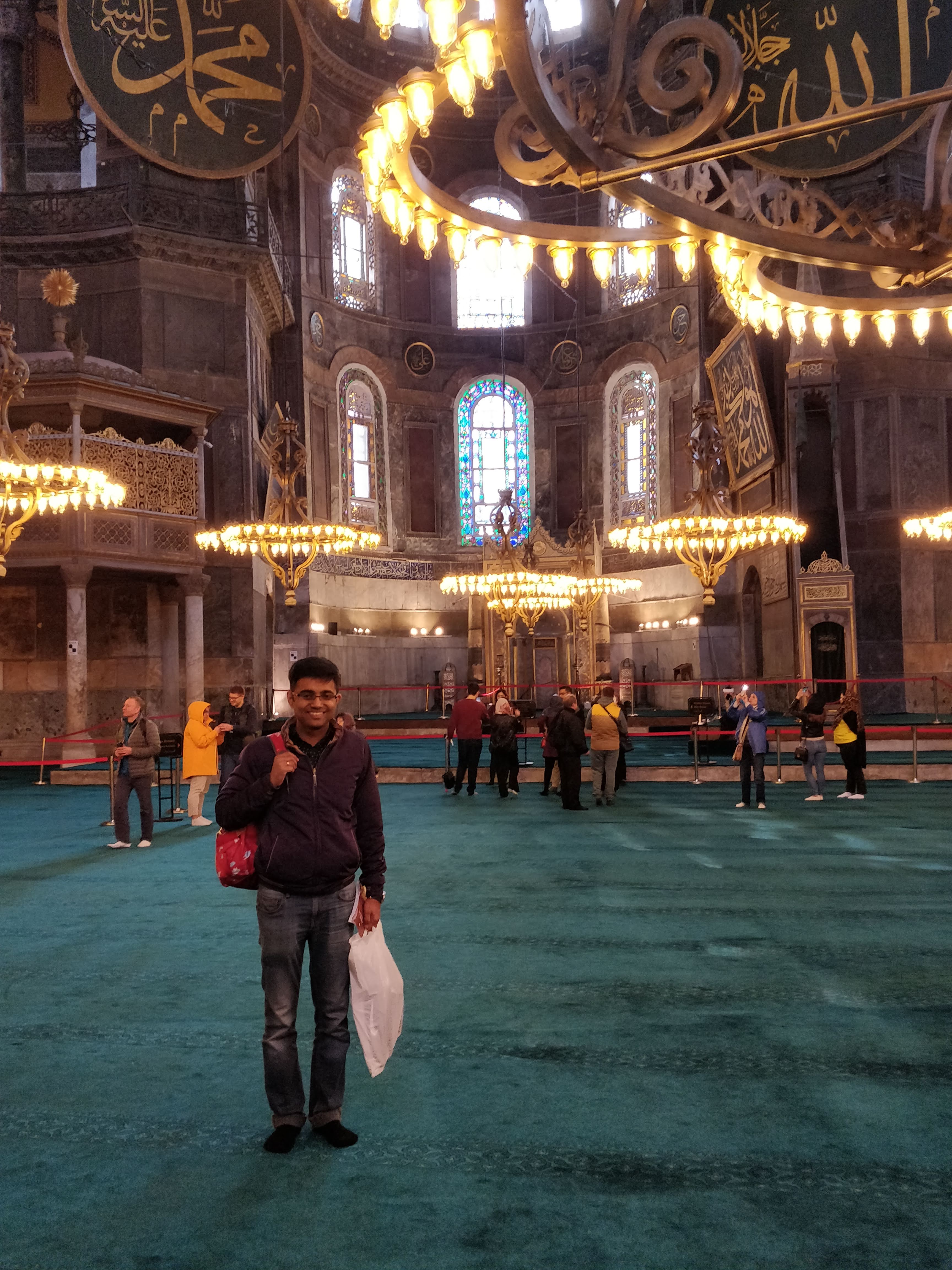 Our first stop for the day was the Hagia Sophia mosque. It is called “Ayasofya” in Turkish. The structure has the strangest history – especially because of its location on the crossroads of civilizations. I won’t get too much into the details (you can Google it) but essentially, it was first built as a church by the Byzantines in 537 AD. Then, the Ottomans took over in 1453 and converted it to a mosque. It stayed that way till 1935 when it was made into a museum and finally (at least till now) in 2020, it went back to being a mosque. This has resulted in the main structure inside looking like a church with a dome and vast columns. Outside, there are minarets that are characteristic of Ottoman architecture.