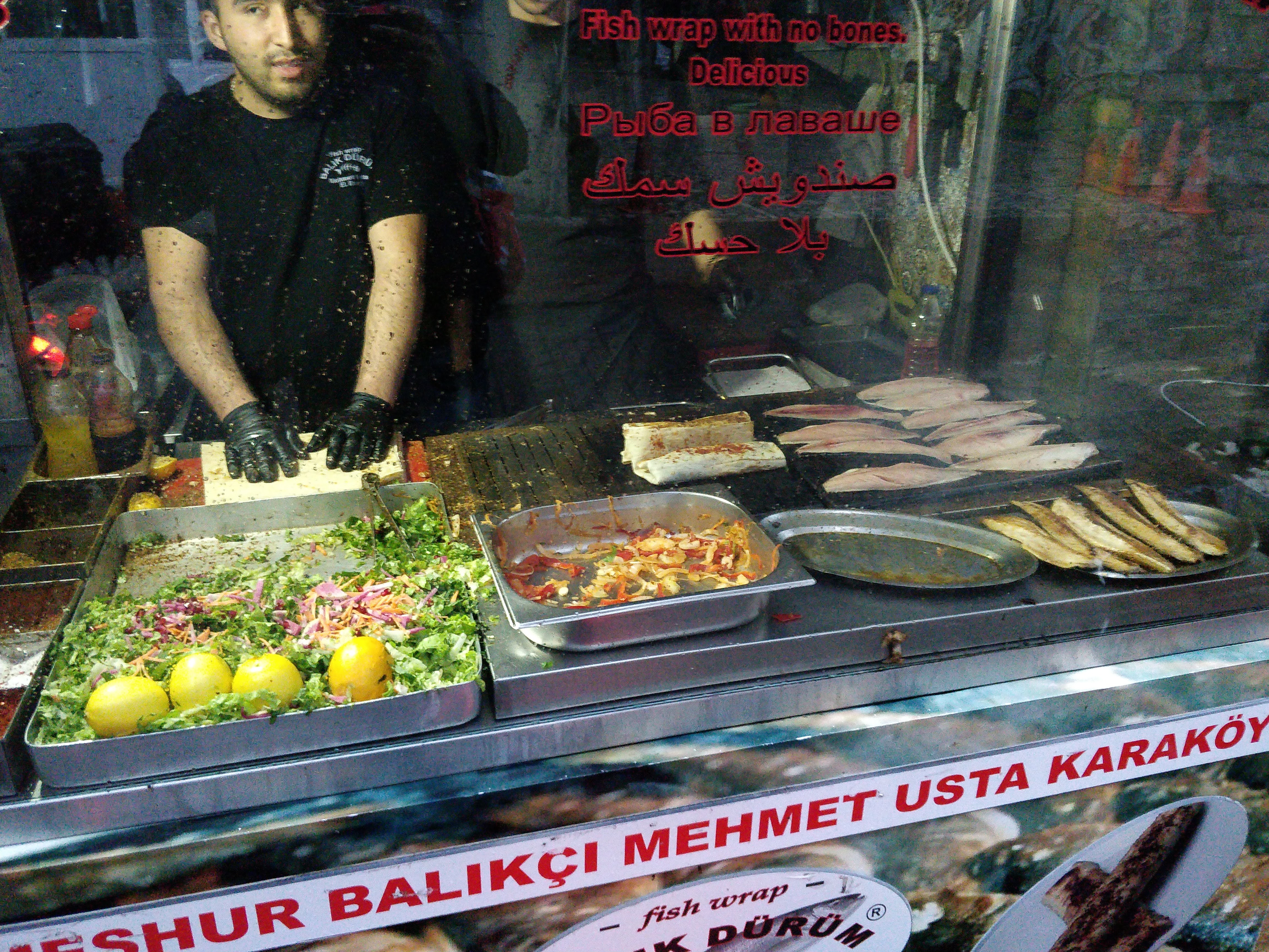 We walked along the narrow paths and reached the fish sandwich place that we had missed last time – Balık ekmek of Mehmet Utsa – a tiny hole-in-the-wall. It had started drizzling and we stuffed ourselves into the tiny shop. We watched as they grilled the fresh fish and made our rolls. Delicious! We were super grateful that we got to come back and eat this!