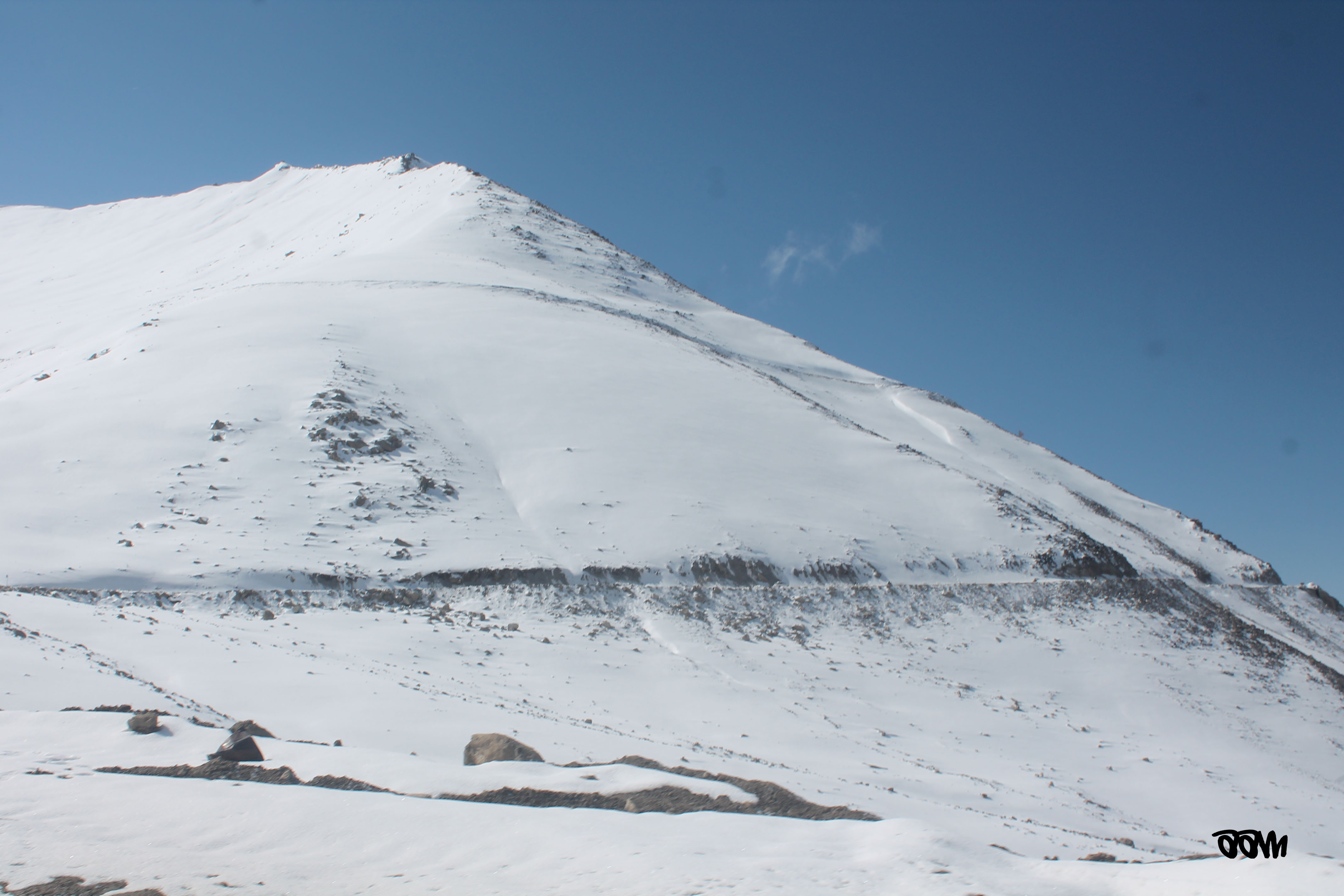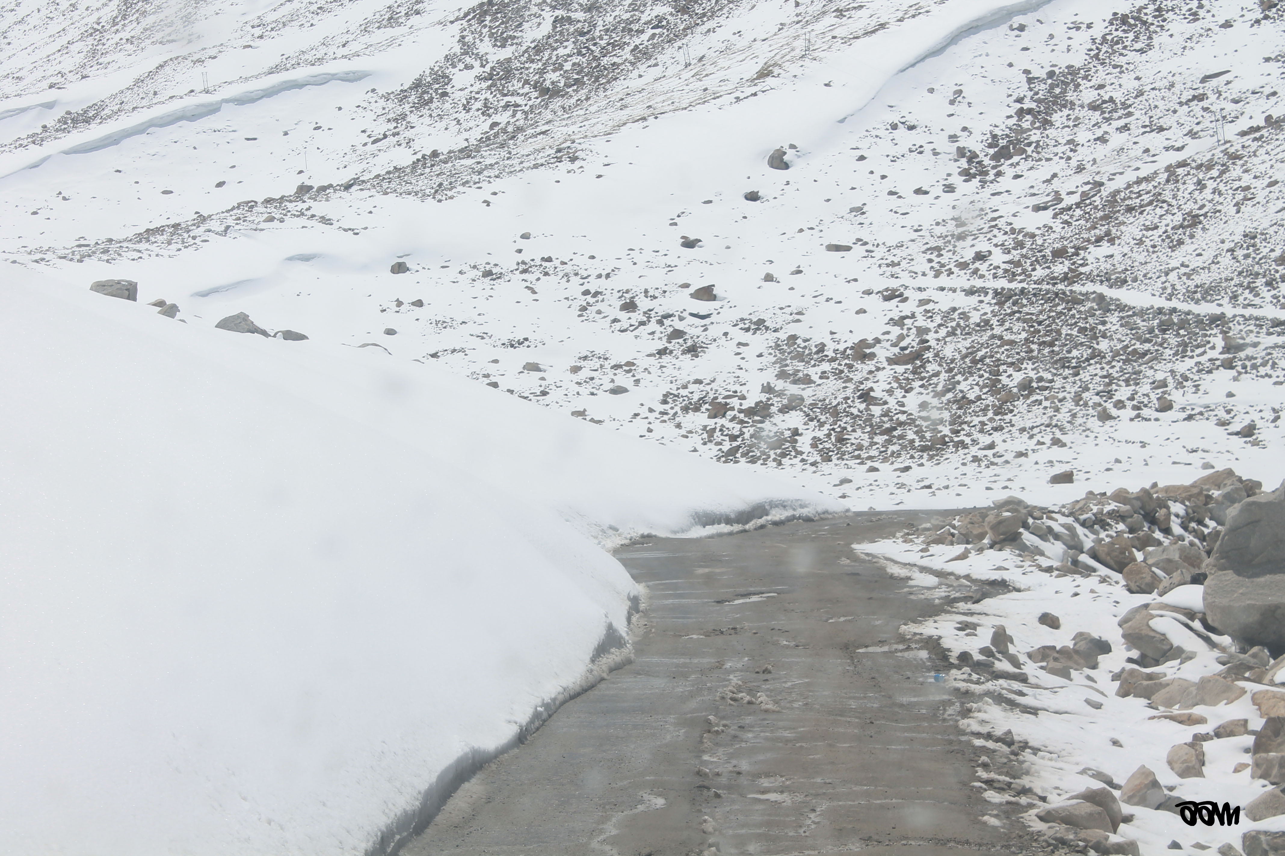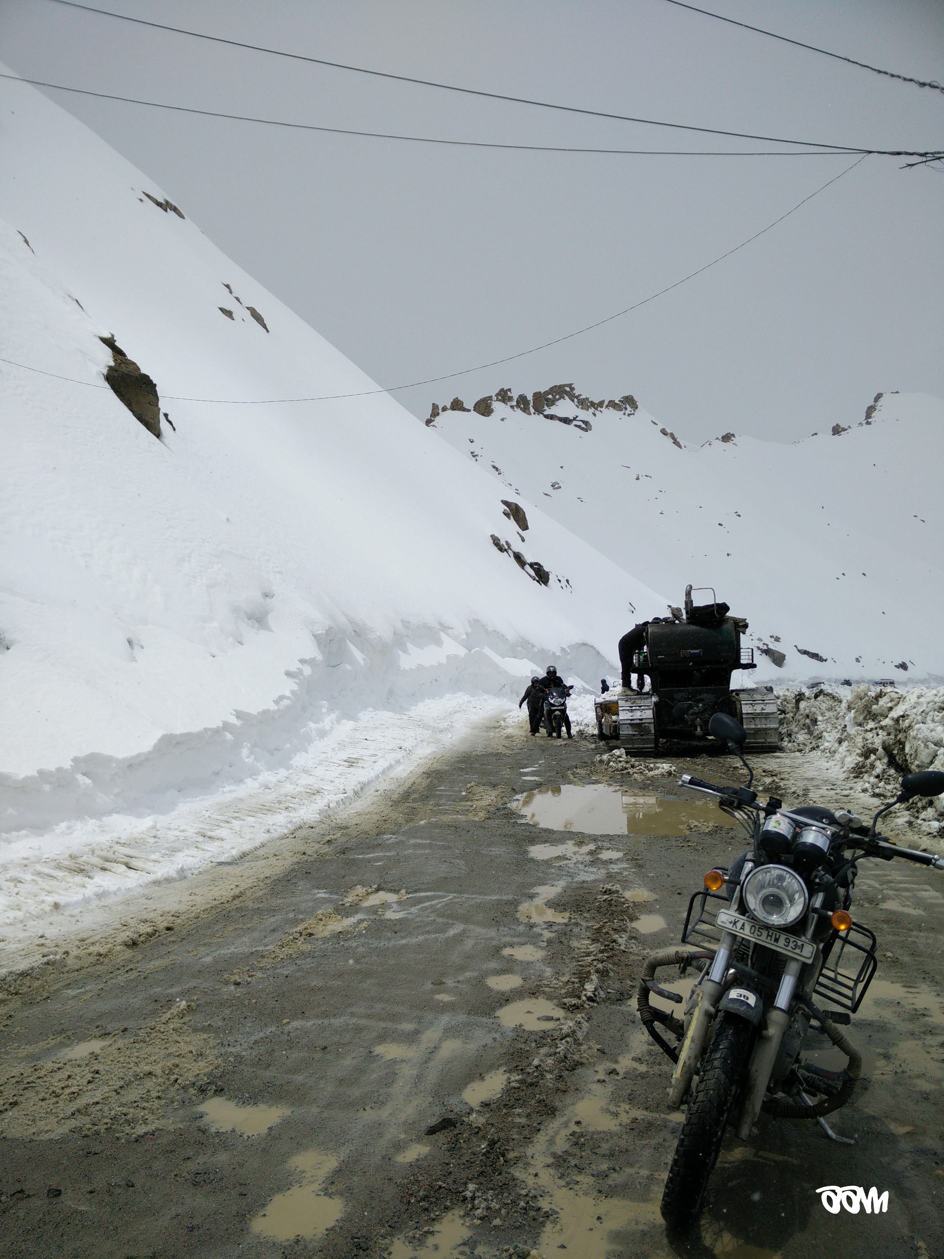 We reached the top after a lot of slipping and skidding, once again huffing and puffing after every small physical effort. We were greeted at the top by a traffic jam! There was snowfall and an army convoy was waiting to move down to North Pullu. But to be safe, the tyres of the trucks were being chained. Even talking for a long time here drains you of energy. It took almost 40 mins for the road to clear and we were on our way.
