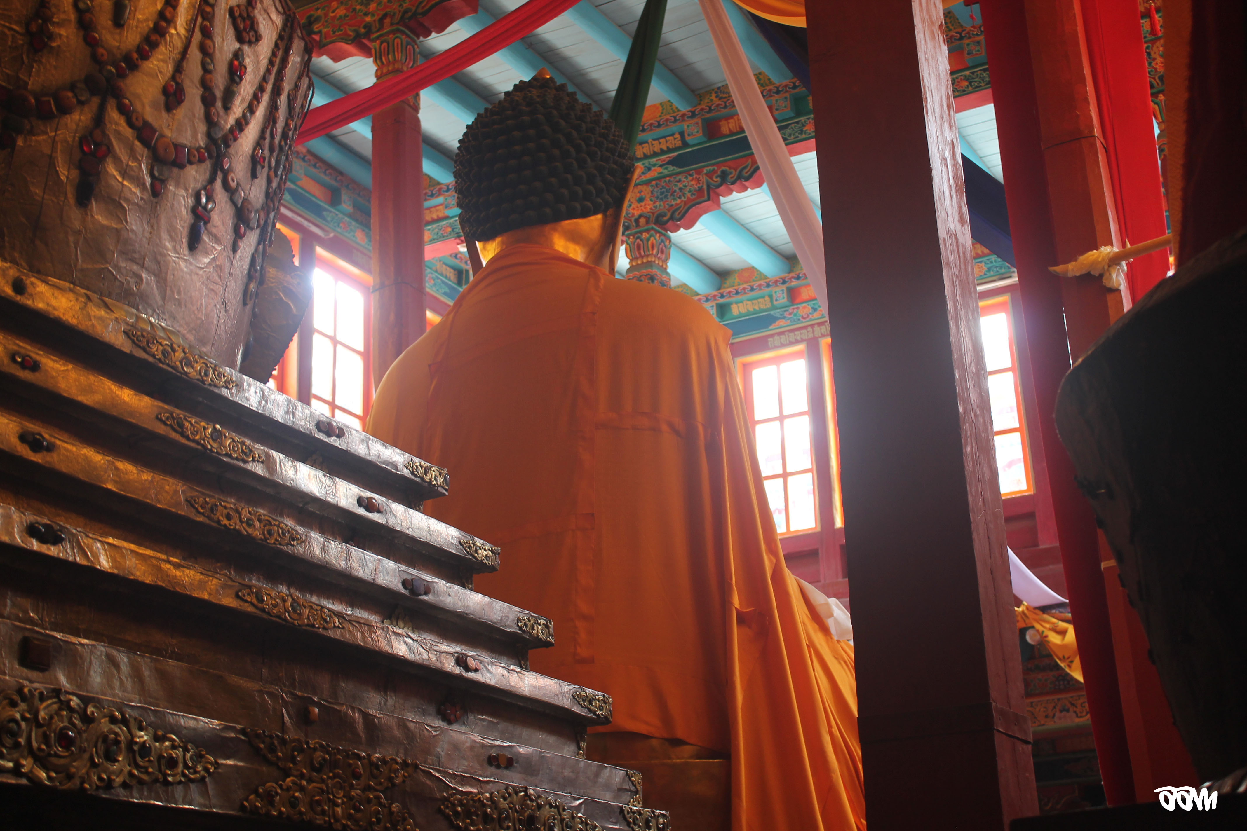 Within no time, a couple of monks would appear with a huge bucket of the same drink and refill the bowls – it looked like a sludgy mix of noodles and soup and porridge – piping hot! The monks would put it under their desks and continue with the next prayer. You could see the life of a monk in that very room – how their lives were totally dedicated to worship and prayer – right from the really small kids to the old men who hardly had teeth left in their mouths. As I headed outside the prayer room, there was a common kitchen where they were serving the same broth that the monks were having – it was some sort of thukpa (noodle soup). I had one small sip – totally burned by mouth! There was a golden statue of Buddha at the top of a huge rock near the monastery – this was the only point visible from a distance. A few of us decided to scale the rock – it was a tedious task!