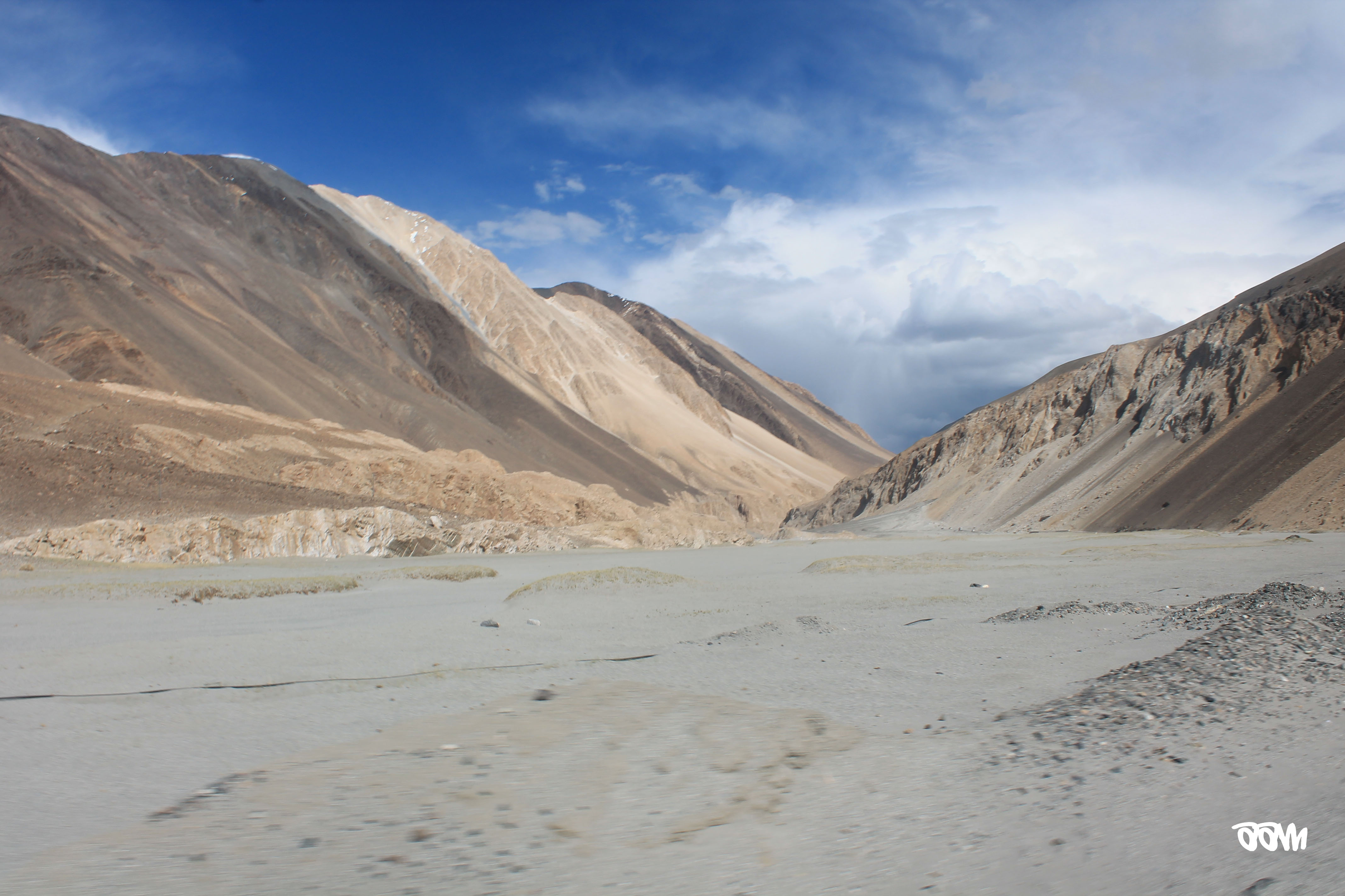 As we started towards the valley, the landscape changed drastically. There was no vegetation on the mountains anymore. It was completely like a desert – oh wait, it looked like a river bed. The mountains had marks of water flowing down them at some point of time. The road just kept going on and on through this desolate yet amazing landscape.