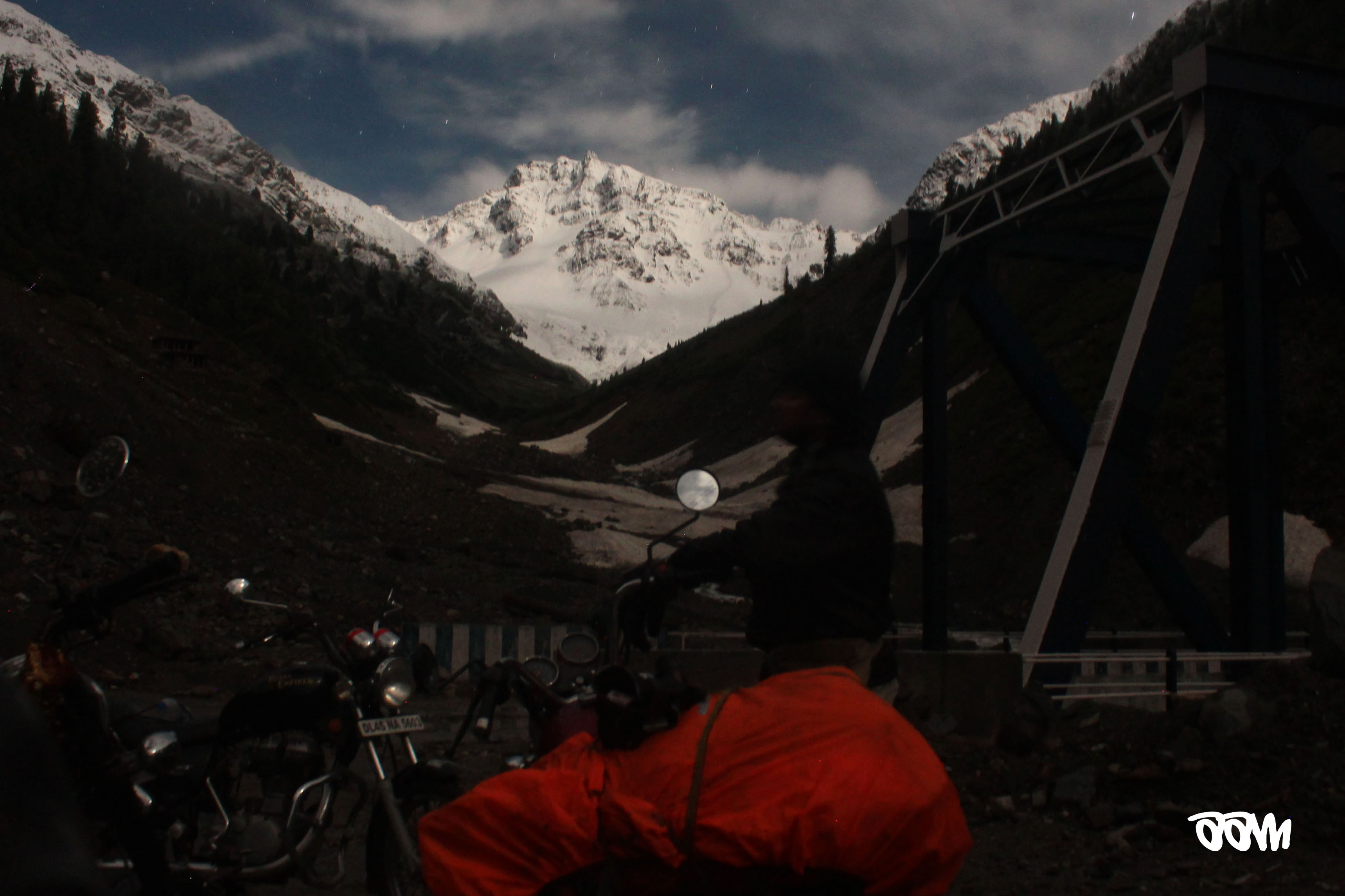 There was moon-light radiating off the snowy peak. It was a beautiful sight. We heard rumbling noises all around and saw mini landslides coming down. The group decided to get back on the bikes and continue.