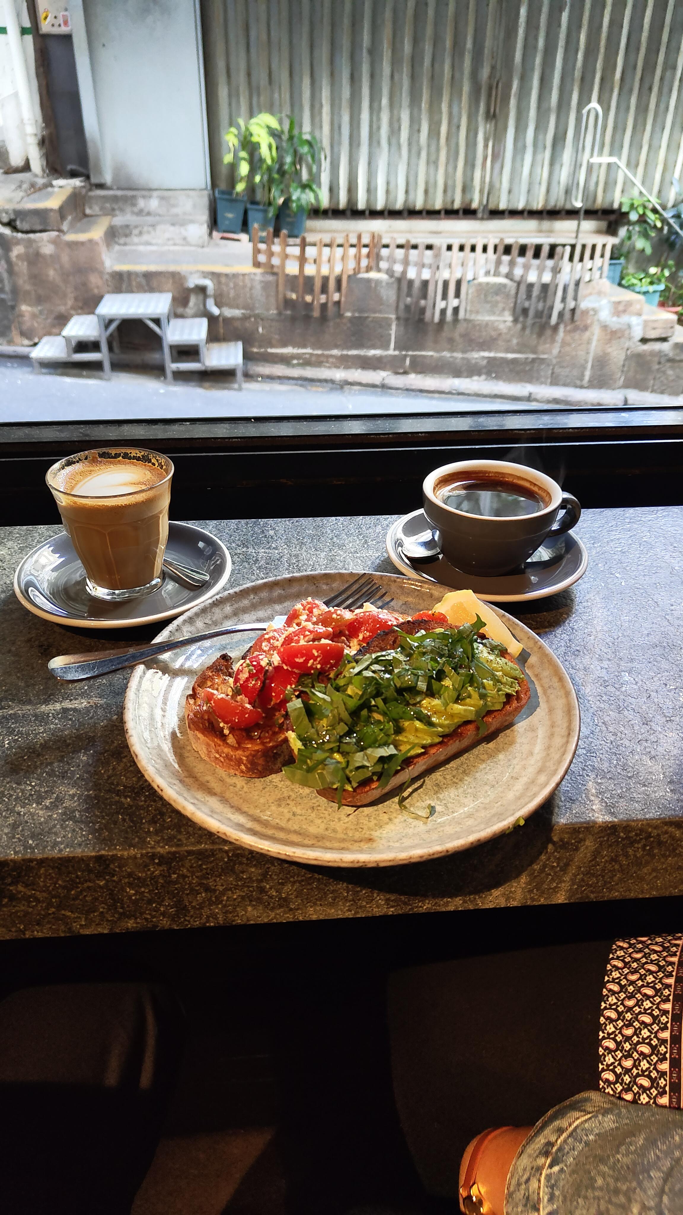 Next stop was a tiny place called Fineprint. It had a very unique vibe – dimly lit, a long table in the center and people sitting all around. Most of them were occupied with their own laptops or books. We ordered a half and half – avocado toast on one side and tomato with feta on the other. It was too good – I had never tasted avocado like this before – it was the perfect combination with the buttered crispy sourdough bread!