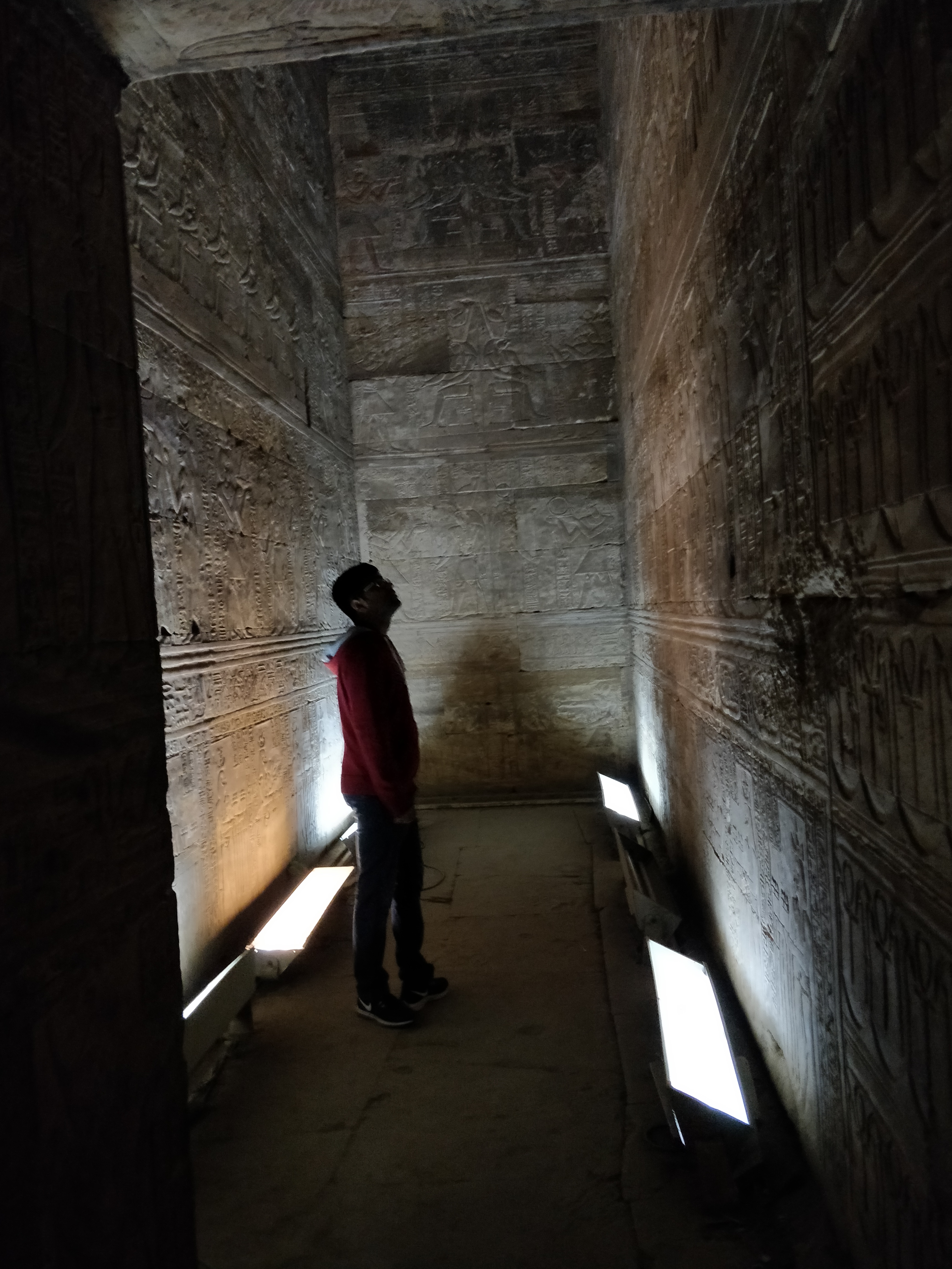 The temple is dedicated to Horus and Hathor and was used as the center for big festivals. The rooms in the temple got narrower and smaller as we moved towards the sanctuary – like a pyramid. Each room inside was raised higher than the previous one – signifying that God stands taller than everyone else. Public access used to be till the outer courtyard and only the king and high priest could enter the innermost rooms for offerings – something we still see in Hindu temples especially in South India. This is what we saw in Bhutan as well.