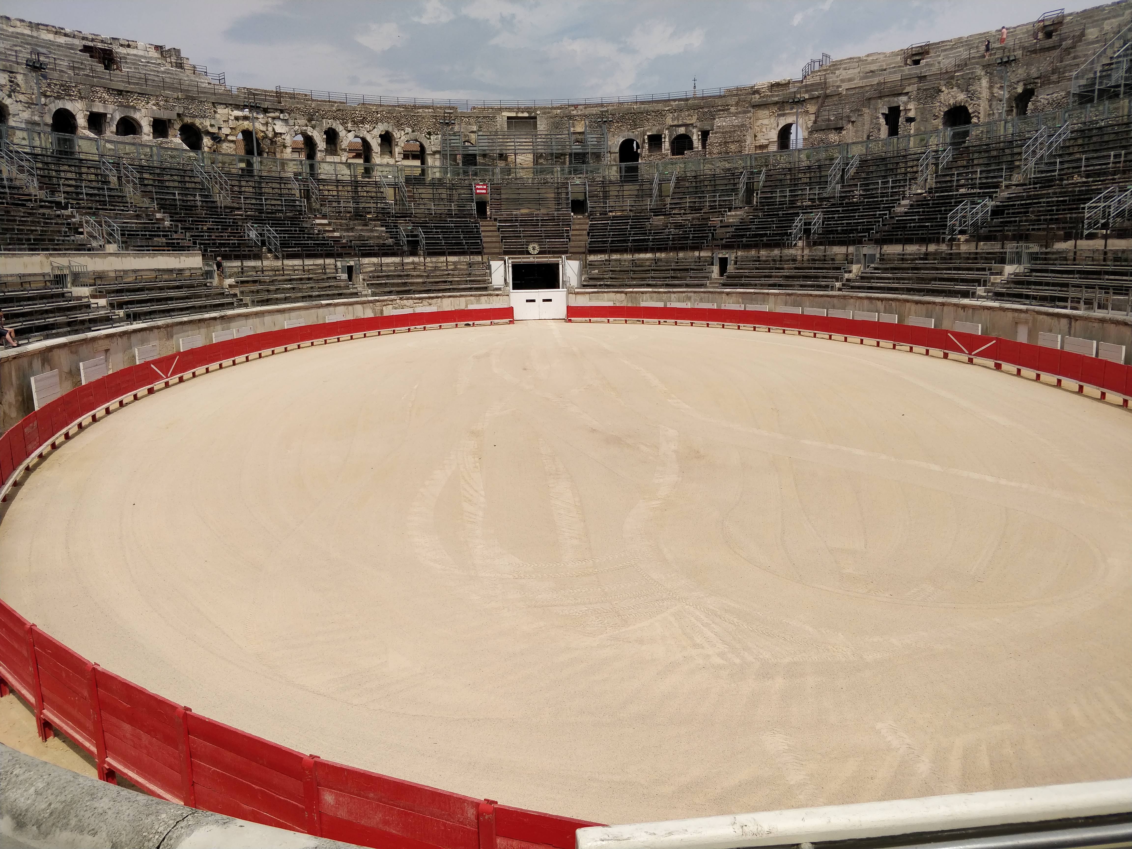 Next stop, the amphitheater – the Nimes Arena. We picked up an audio guide along with the tickets to learn about the history of the place. It was built around the year 100 – around the same time as the Colosseum. It was a venue where gladiators were put up against wild animals and other fighters. Today, the arena is used as a venue for concerts! The center was covered in sand and the seating was such that everyone got a good view of it.