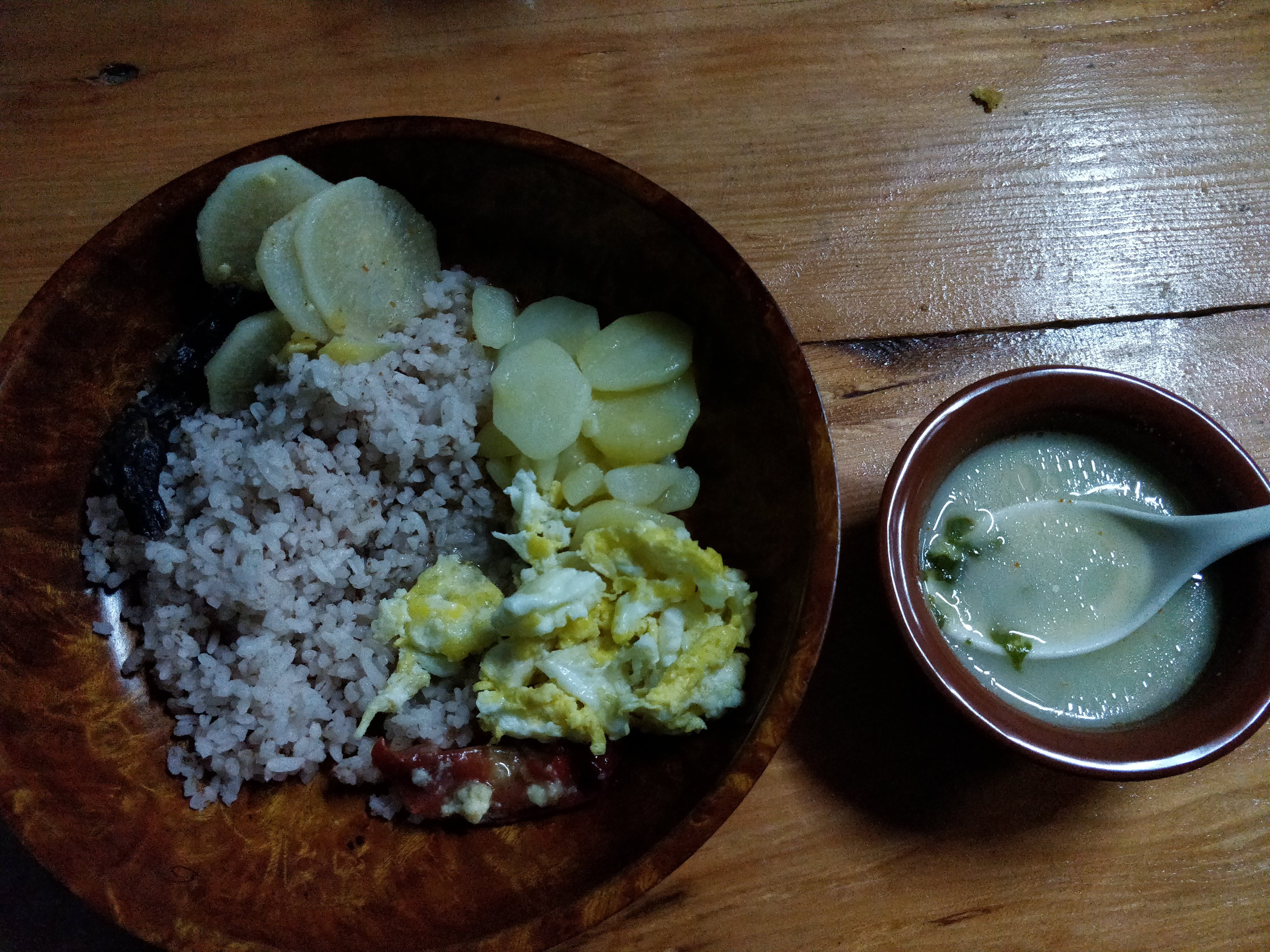 We then went into the home and joined the family for dinner. They started us off with some butter tea – a pink tea which really warms you up from the inside! The food was a reflection of Bhutan itself – simple yet delicious. Rice, scrambled eggs, boiled potatoes, chillies, dried meat and some soup.
