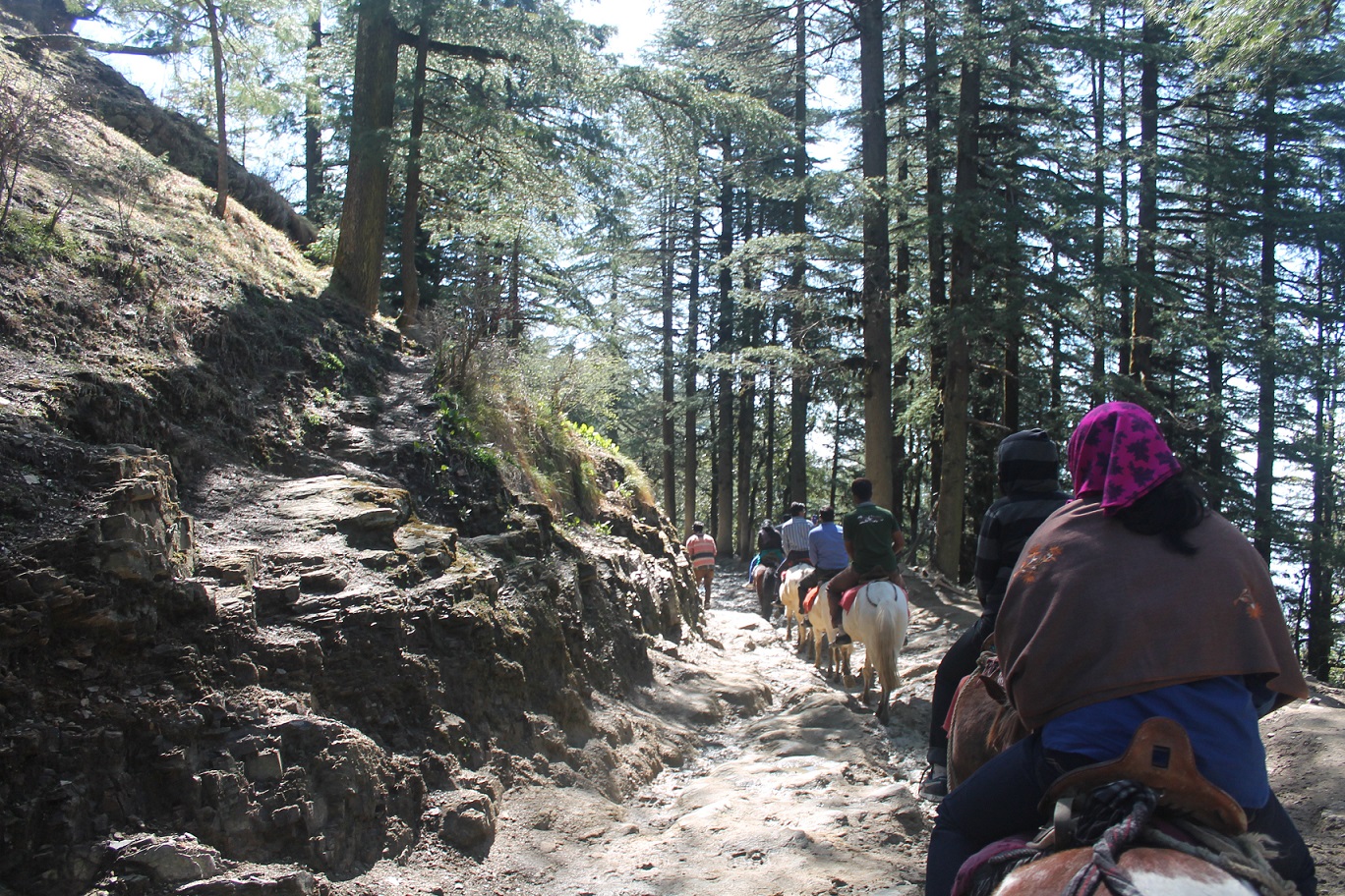 We reach Kufri which is about 20km from Shimla. Horse-rides are the “thing” here. So we mount them and they carry us through a trek full of mud, slush and stones. It had rained heavily with hail-stones the previous day and that made the trek even more slippery. The trek is quite steep and the horses make their way up.