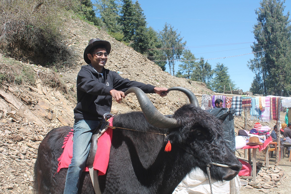 At the other side, there is a small area blocked off with a bunch of telescopes inside. Apparently, they show 10 significant points in the mountains for a 100 bucks. It’s not about the economics of it – when you’re out on a trip, make the most of it – that’s my funda! After all, you can’t see these points sitting at home in Mumbai (well you can on the internet, but then it’s not the same thing, is it?) So we are shown temples, the hotel where Shimla Pact was signed, many shooting scenes, the Patiala palace used in the movie “3 Idiots” as the Chanchad house, the holy peaks of Kedarnath and Badrinath, Kinnar Kailash, the Indo-China border and the tallest point in Shimla which had the Shitla Mata temple. We finish our sight-seeing and go for some classic Himachal photography – all dressed up in the traditional clothes; followed by climbing a yak and clicking pics – like a cowboy! And at the end of the day, selfie toh banta hai yaar! 😀