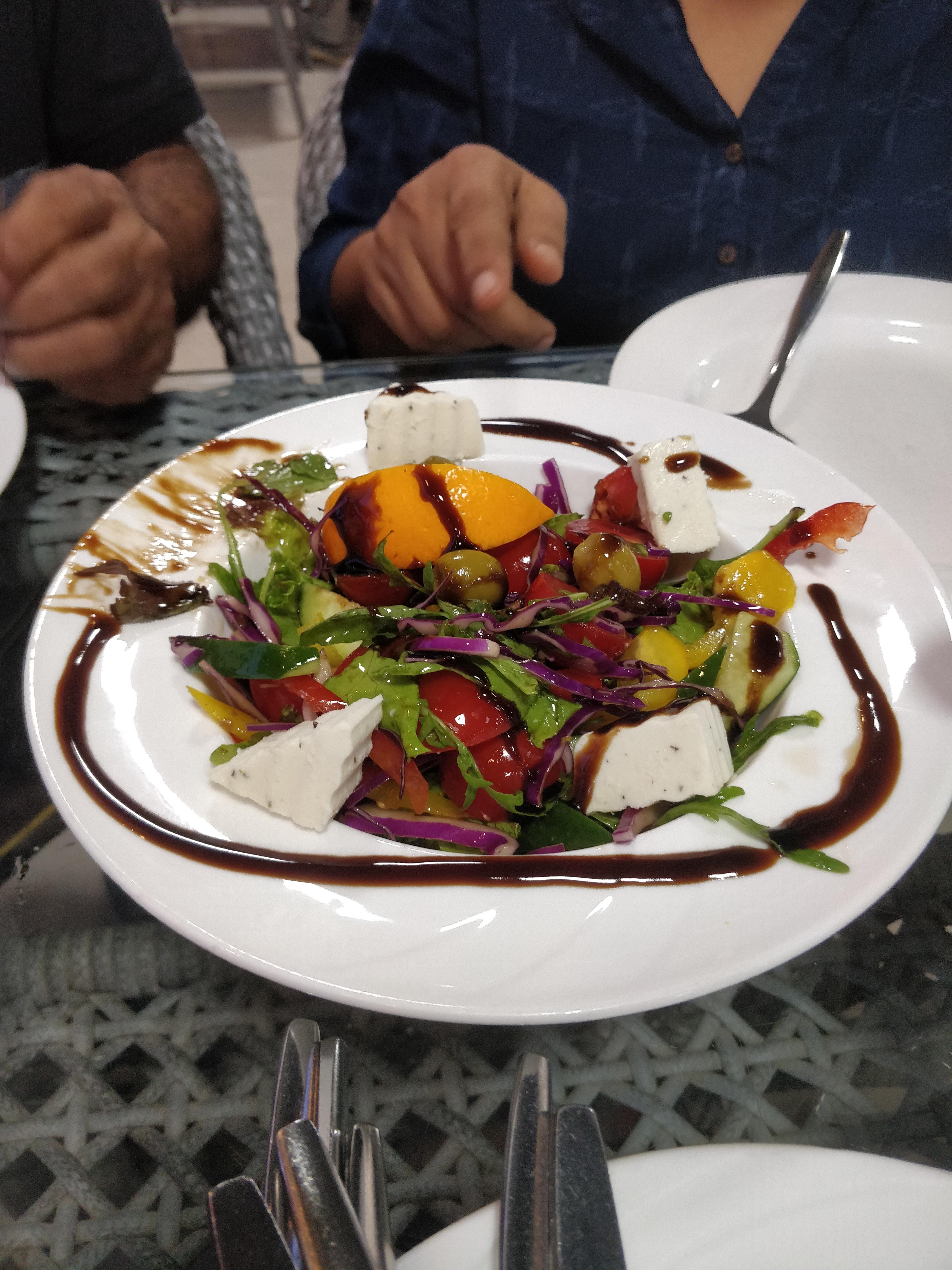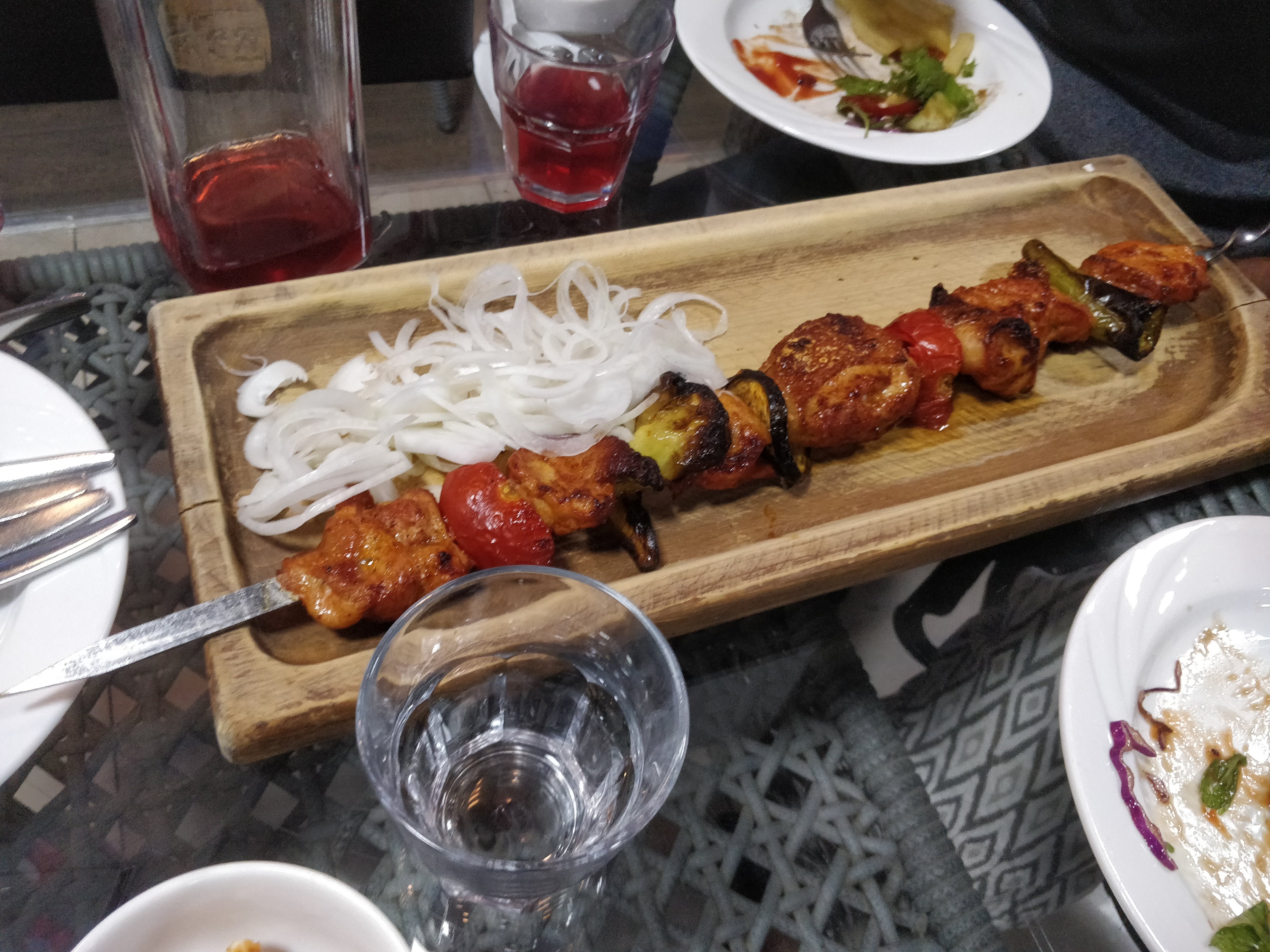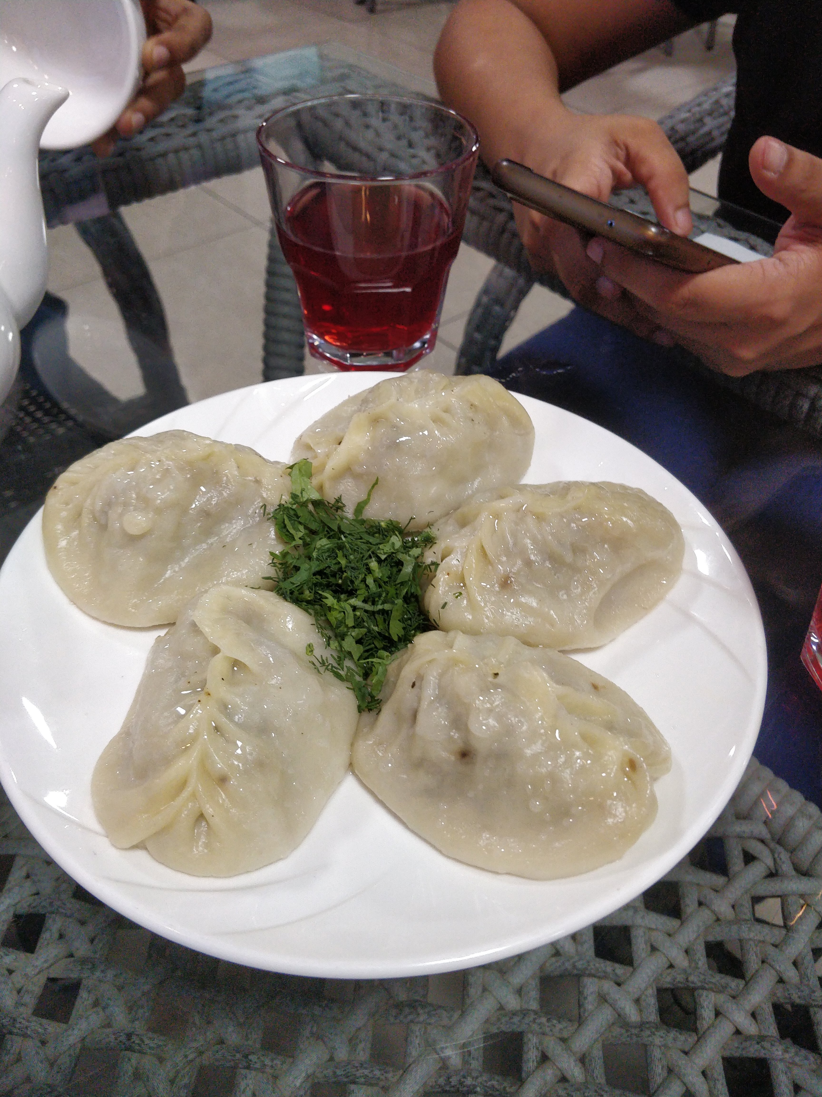Soon, our host arrived and he took us to a place called Fayz Cafe. It was right on the ring road. The place had a bunch of sprays going off right at its entrance – it was meant to offer relief from the heat – we would see a lot more of this throughout our trip. On the way inside, we saw an entire line of kebabs being grilled. We ordered some manti (dumplings), fries, grilled “caucasian” chicken, kompot (a red juice drink that everyone had on their table), Greek salad and tea. Everything tasted good – the veggies were fresh and so was the meat. Parth was off playing with all the waiters and waitresses. So much so, that when I was walking around with him, I could hear them call “Parth, Parth!”. The sun set around 8pm.
