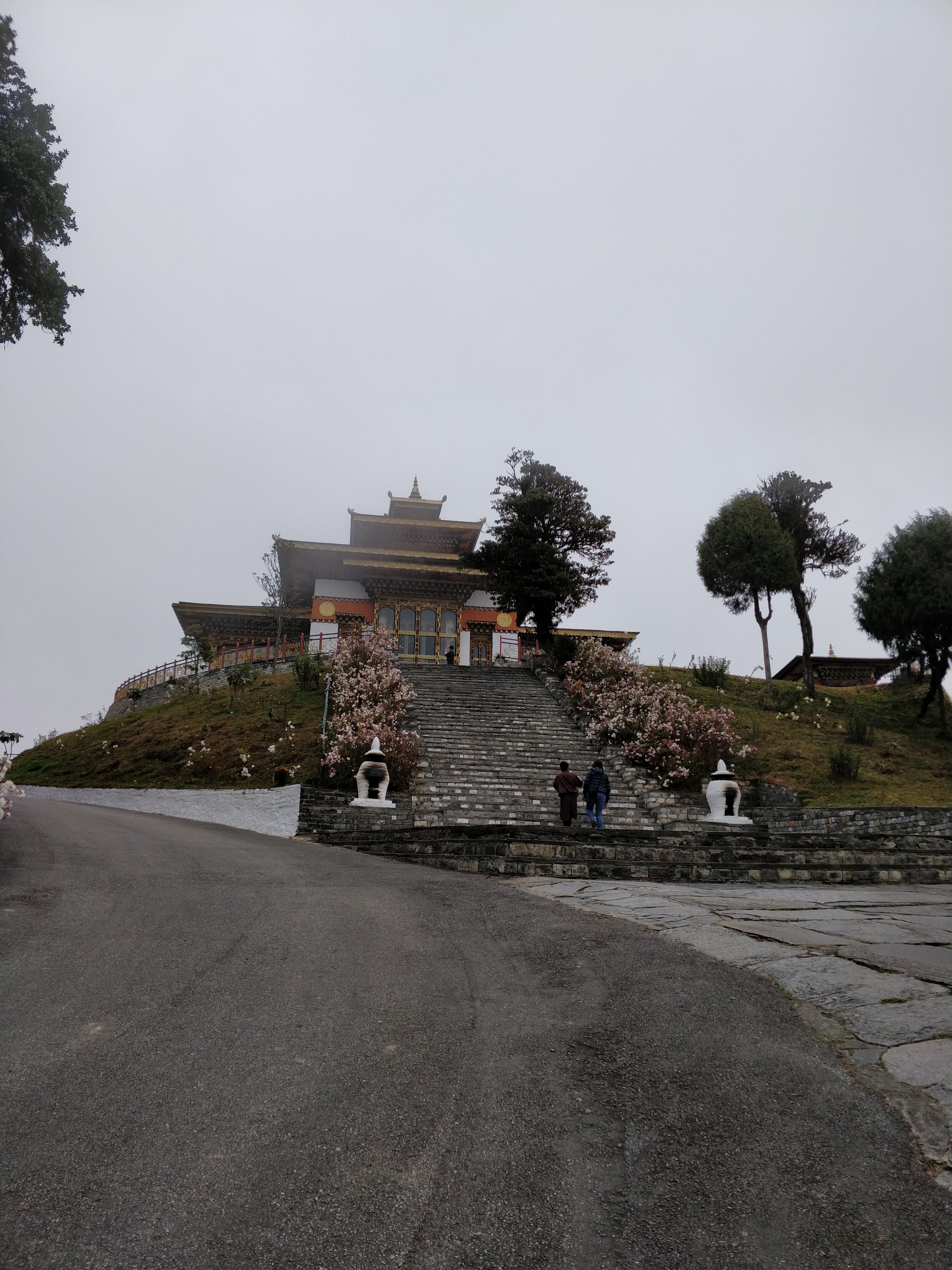 Near the chortens, a short walk up will take you to the Druk Wangyal Lhakhang – a beautiful temple with flowers on both sides of the steps leading up.
