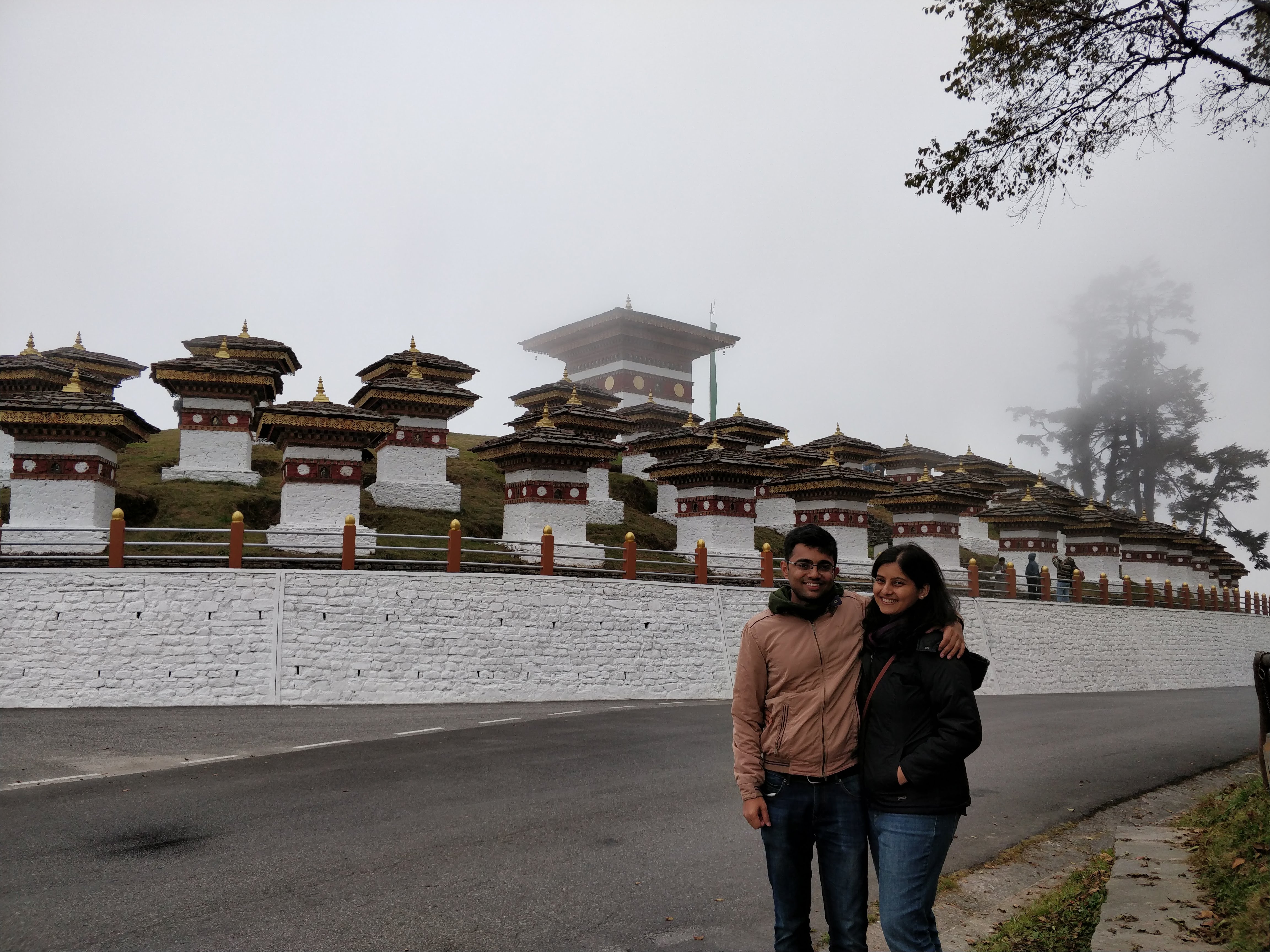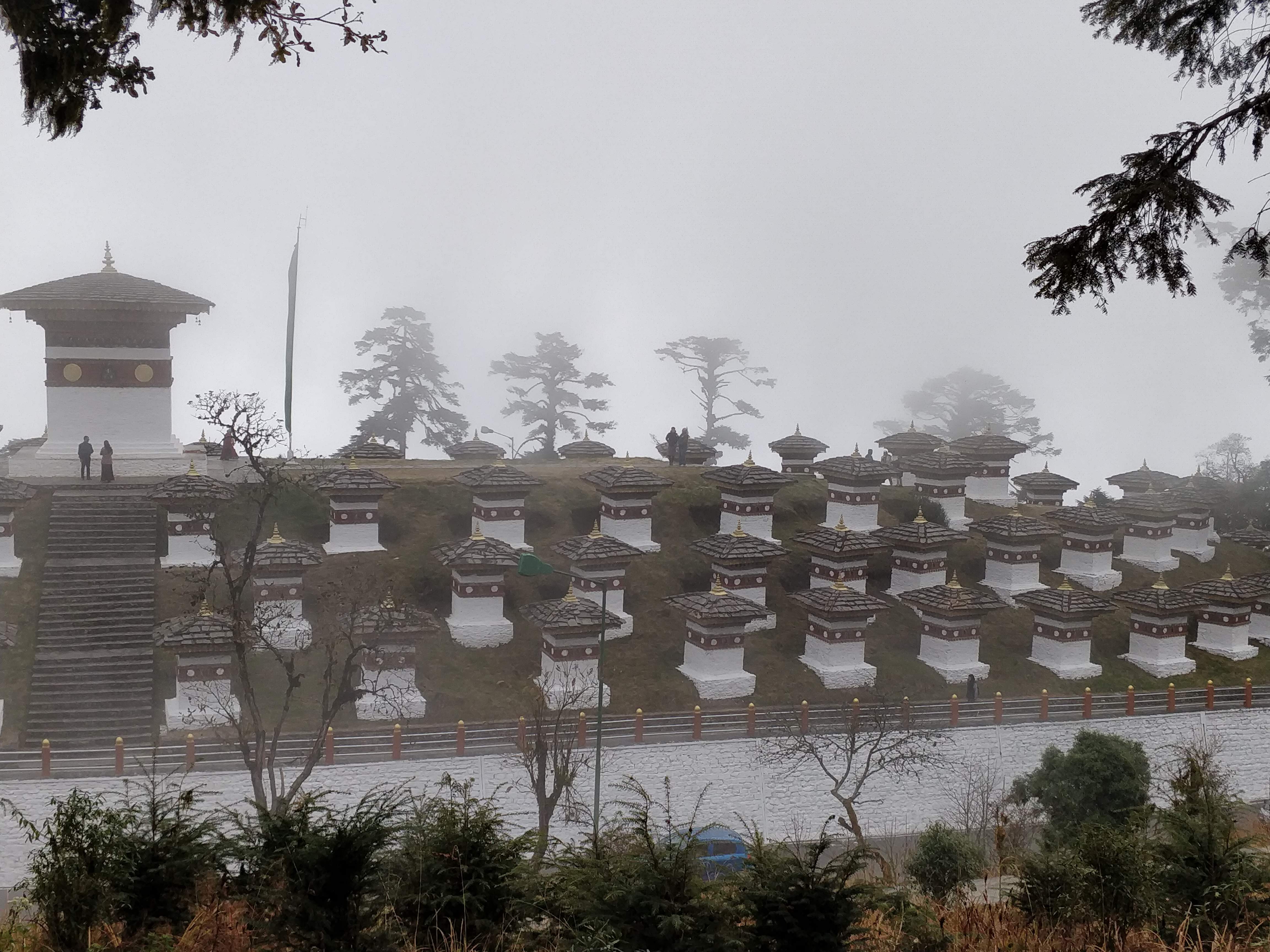 Early next morning, we started on our way to Punakha. On the way, we had to cross the mountain pass of Dochu La. On a clear day, you can see the snow-covered peaks of the Himalayas from here. But we were greeted by a thick sheet of fog. This gave the place a mystical other-worldly look!
