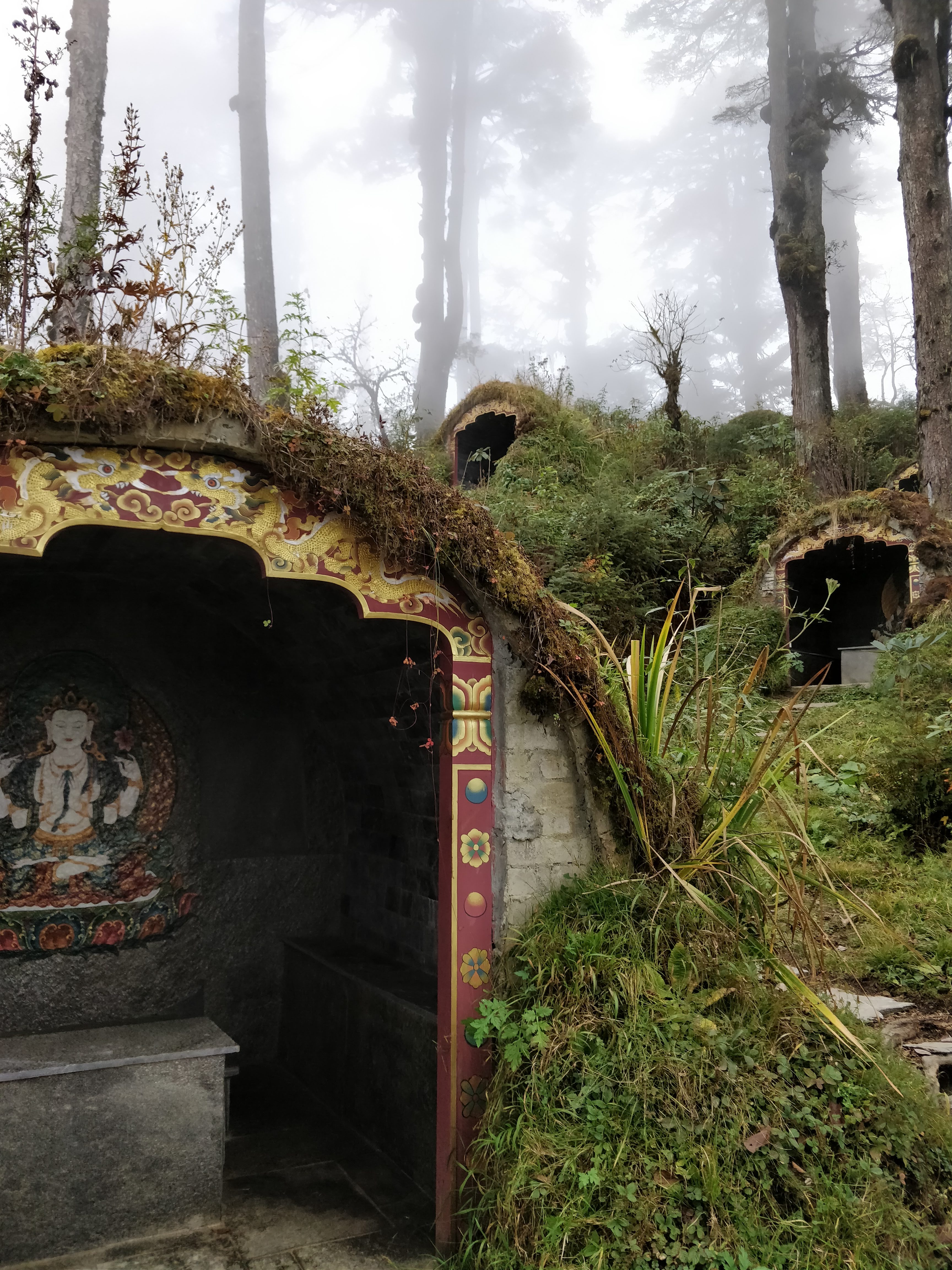 On the other side of the road, we saw signs pointing towards hidden meditation caves. The mist added to the experience as we climbed up the slope looking for the caves.