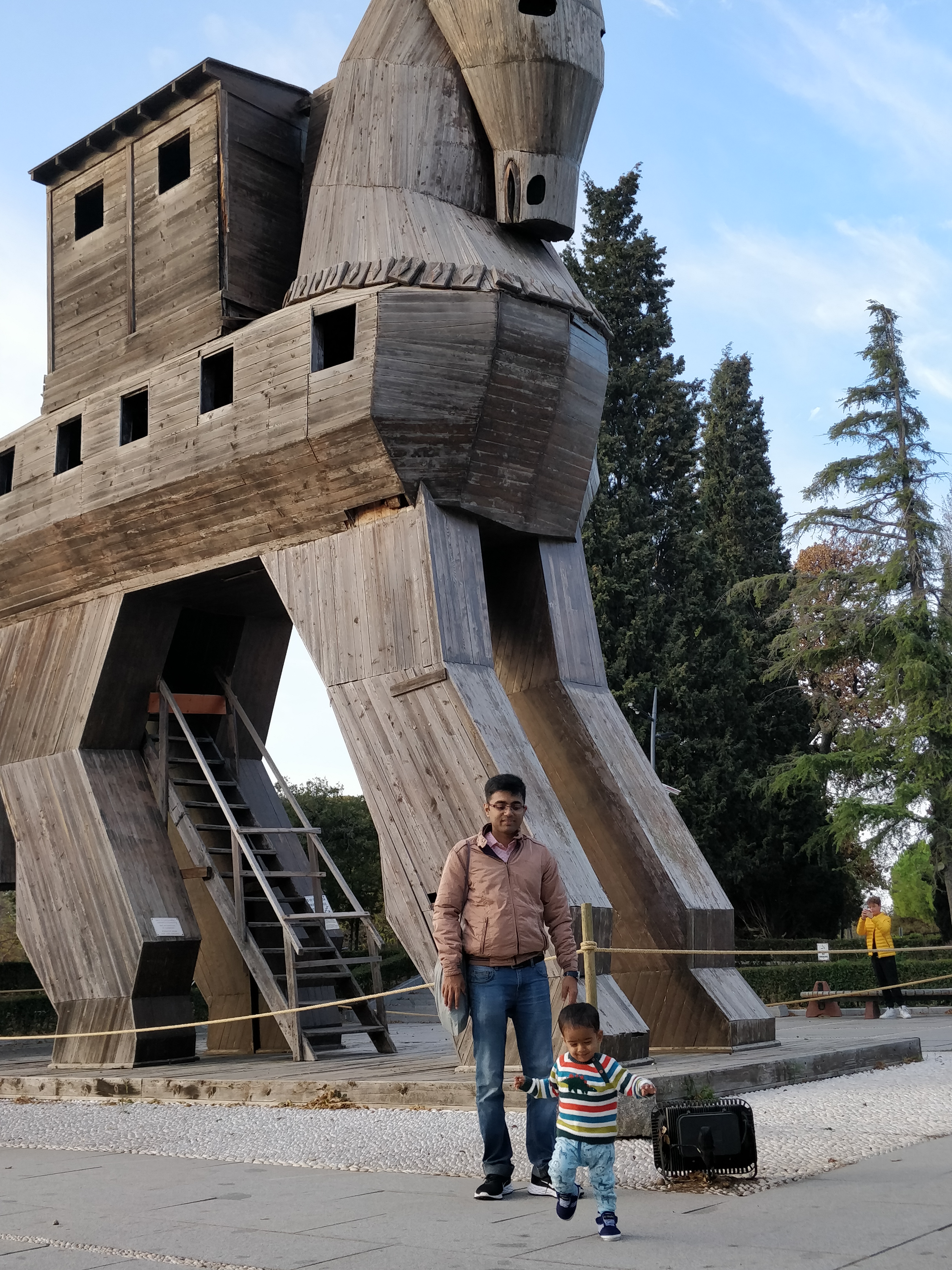 At the entrance we were greeted by giant dogs. The street dogs here were really huge. We somehow got in without being mauled by them. Inside was a giant wooden Trojan horse. It was made by an artist around 50 years ago. We clicked some pics with the horse – it was really beautiful with the blue skies.